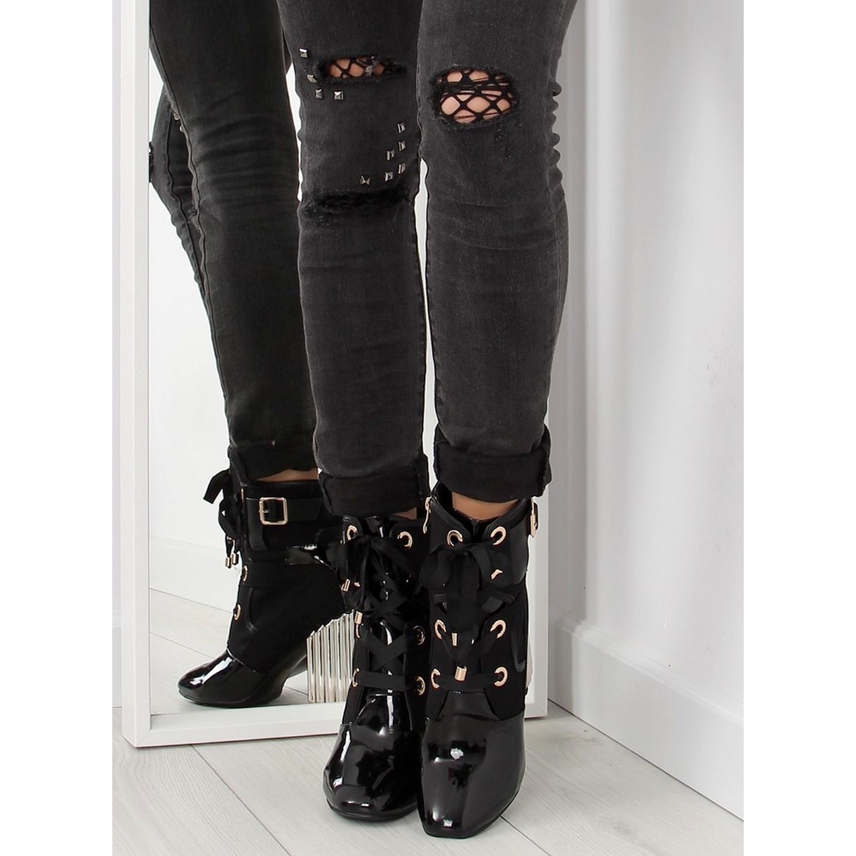 Fabricate din piele lăcuită și țesătură cu o textură de pânză, aceste cizme arată cu adevărat impresionant. Tocul original de 10 cm înalt aduce un plus de clasă și vă permite să vă simțiți încrezători în orice situație. Designul cu șireturi a fost îmbogățit cu un fermoar practic, ceea ce face ca punerea lor să fie o plăcere pură.