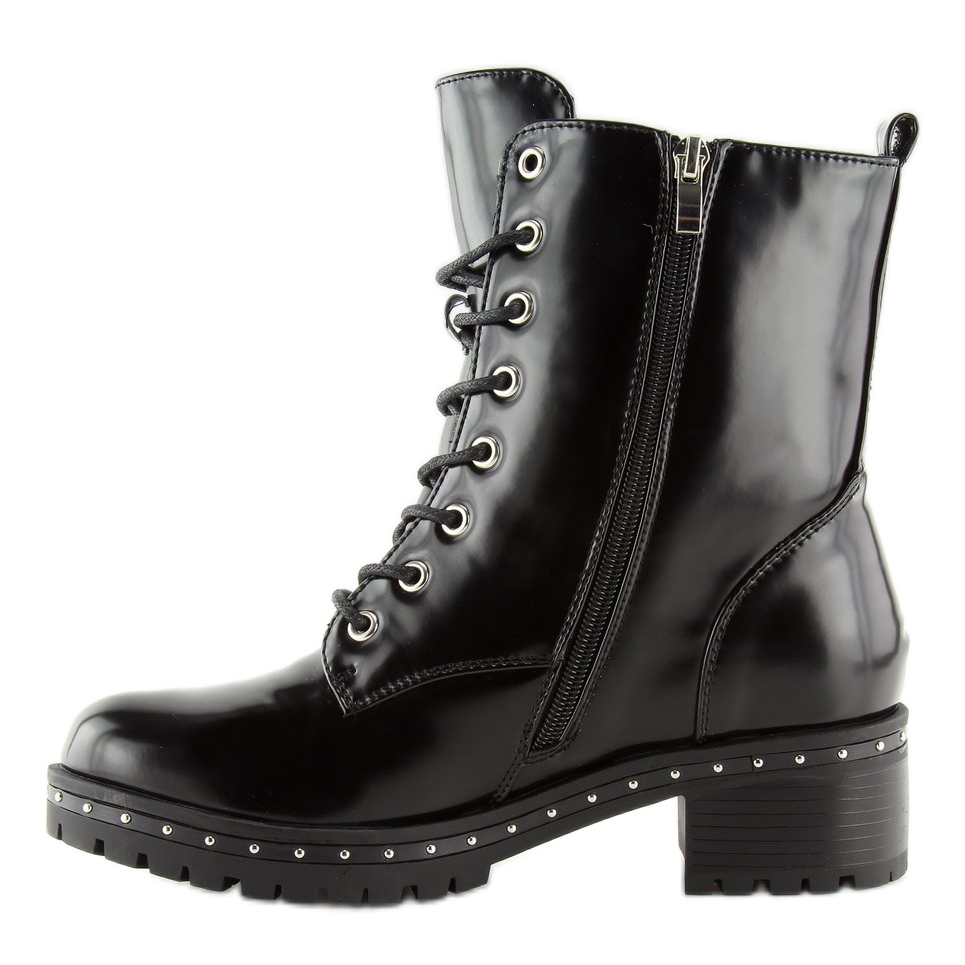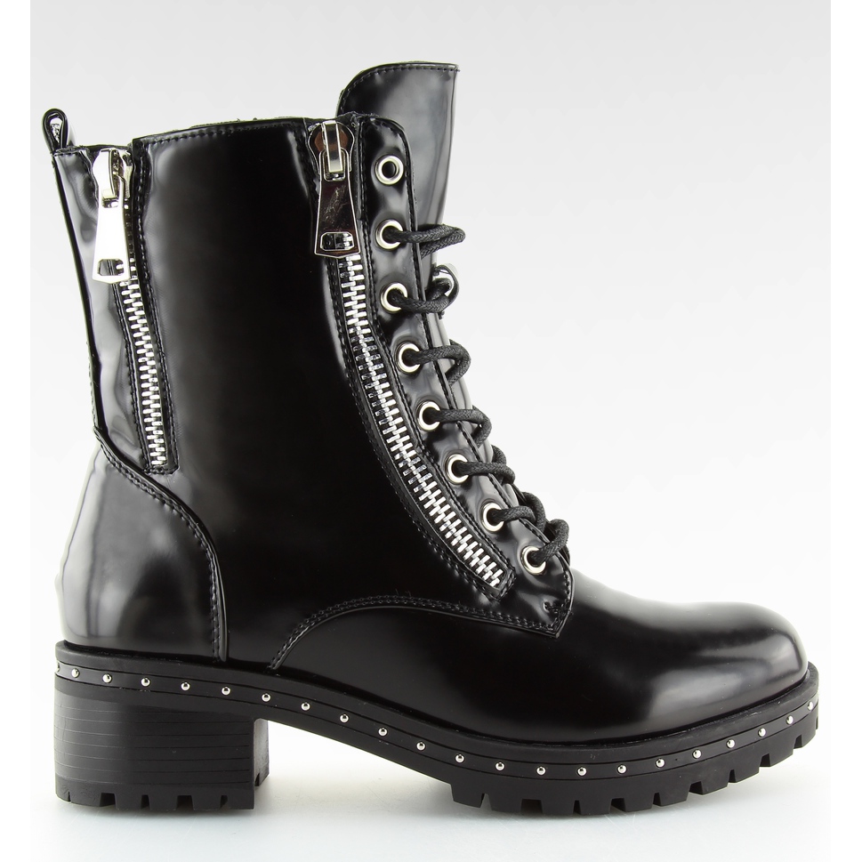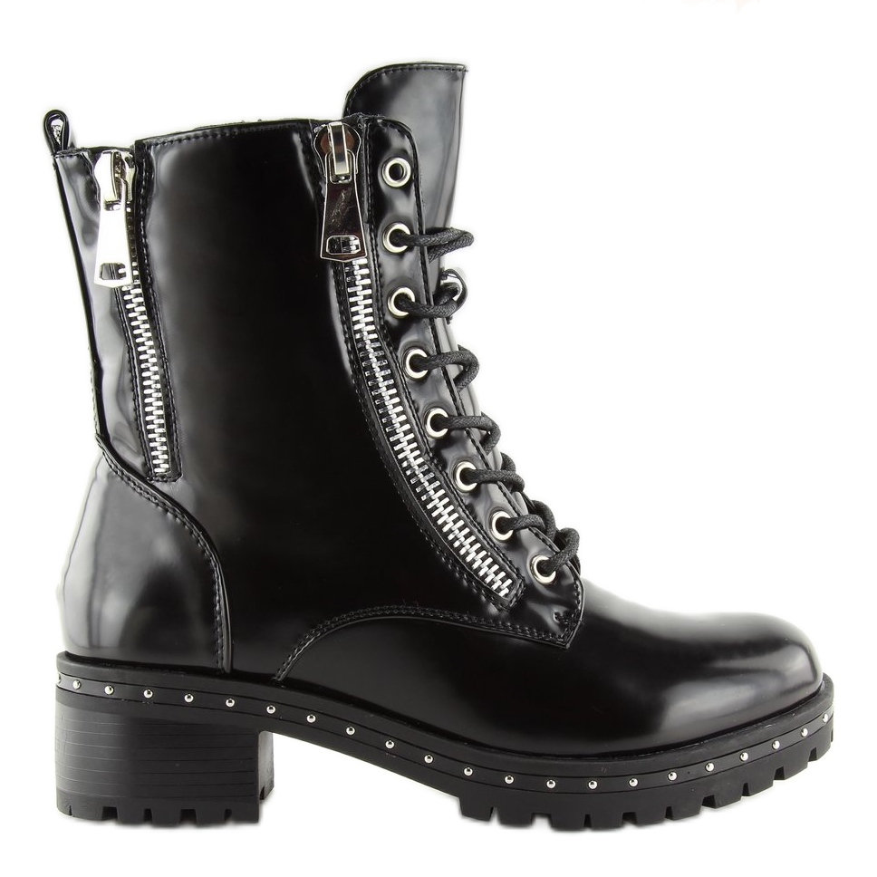 Cizmele bovver negre A-40 de damă sunt alegerea perfectă pentru femeile care doresc să adauge un pic de stil rock în garderoba lor. Fabricate în întregime din piele ecologică de înaltă calitate, aceste botine au un finisaj patentat atrăgător. Știfturile atrăgătoare de-a lungul tălpii și fermoarele decorative argintii sunt detalii care le dau caracter și le fac să iasă în evidență în mulțime.