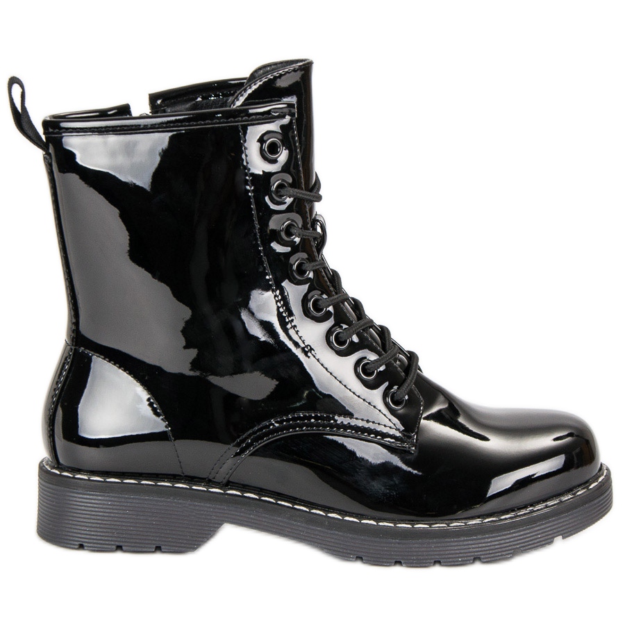 Cizmele bovver negre VINCEZA sunt o incaltaminte excelenta care cu siguranta va atrage pe toti iubitorii de stil la moda. Din piele ecologică lacuită, acești pantofi cu căptușeală înaltă se potrivesc perfect în tendințele de toamnă și iarnă. Șireturile lor practice și fermoarul lateral facilitează punerea lor și ajustarea la picior.
