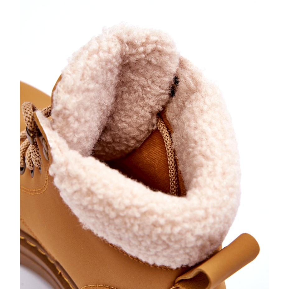 Captive elegante din piele ecologică într -o nuanță caldă de cămilă cu accente bej. Model medicamentos, cu nas rotunjit, încorporat pe o platformă stabilă cu un călcâi plat (înălțime de 4 cm). Partea superioară ajunge la gleznă; O haină plăcută din piele de oaie a fost folosită în partea de sus a superiorului și a interiorului limbii, iar interiorul a fost izolat cu o pătură de încălțăminte - perfectă pentru zile mai răcoroase.