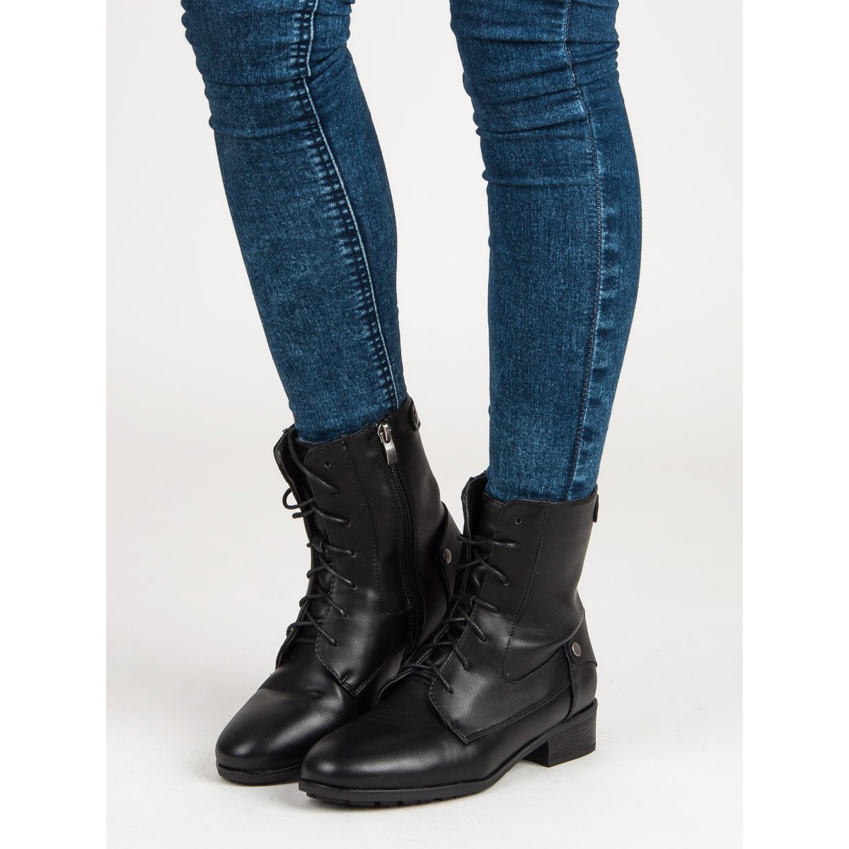 Realizați din piele ecologică strălucitoare, de înaltă calitate, acești muncitori combină durabilitatea și eleganța. Tocul lor delicat și plat, înalt de 3,5 cm, îi face nu numai la modă, ci și confortabil de purtat ore lungi. Cizmele sunt prinse cu fermoar, ceea ce le face mai ușor de pus, iar șireturile suplimentare permit o potrivire perfectă pe picior.