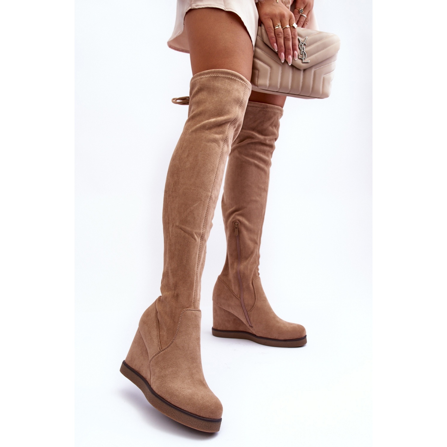 Cizme de damă cu partea superioară legată deasupra genunchiului. Model slip-on, cu fermoar suplimentar pe partea superioara. Asezat pe o pană și platformă. Izolație la nivelul piciorului. Contorul călcâiului este rigidizat. Acest stil unic va încânta pe toată lumea!