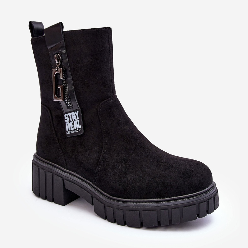 Cizme elegante, negre, din Eco Suede, care combină un aspect la modă, masiv, cu confortul de a purta. Situat pe o platformă solidă și tocuri plate, izolate cu o pătură de încălțăminte - perfectă pentru zilele mai răcoroase de toamnă și de iarnă. Fixat cu o încuietoare practică pe interiorul superior, cu nasul rotunjit pentru confort. Un design clasic, uniform, va funcționa în multe stilizări cotidiene și casual.
