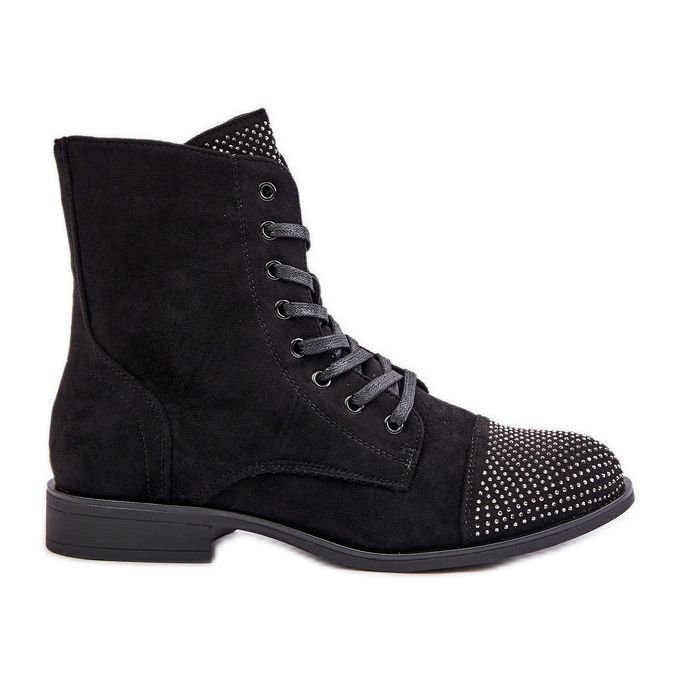Cizmele de piele de căprioară eco -negre decorate cu degetele plate, sunt o combinație de stil și confort, ceea ce va satisface cu siguranță fiecare iubitor de accesorii la modă pentru zile mai răcoroase.