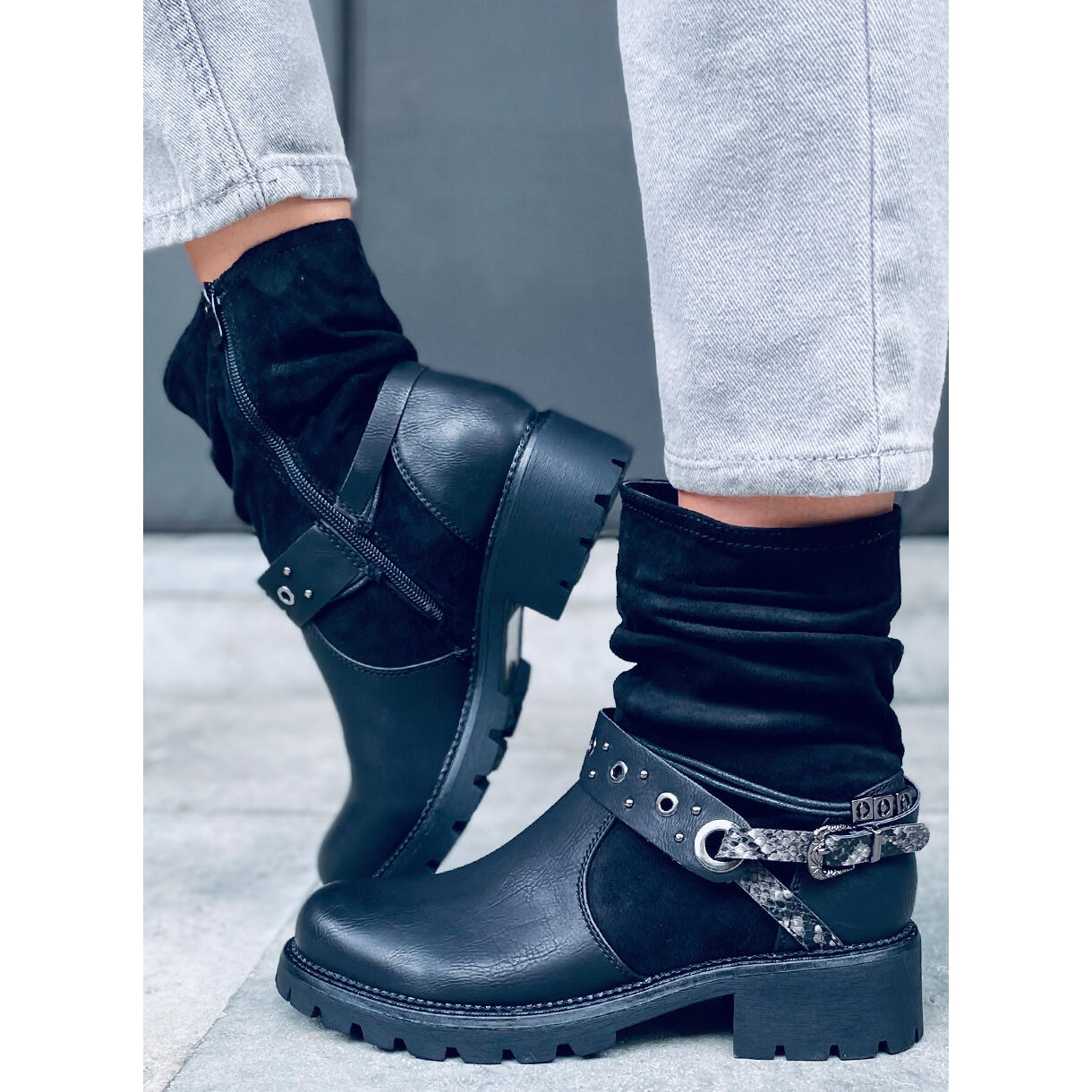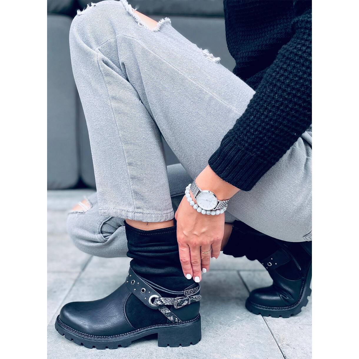 Botinele Lorde Black cu un protector sunt o propunere ideală pentru femeile care apreciază stilul și confortul în utilizarea de zi cu zi. Aceste cizme elegante, negre, într-un stil militar la modă, îmbină pielea ecologică de înaltă calitate și pielea de căprioară ecologică, ceea ce le face să arate extrem de atractive. O curea cu motiv de piele de șarpe adaugă originalitate și un caracter unic, deosebindu-le de alte modele.