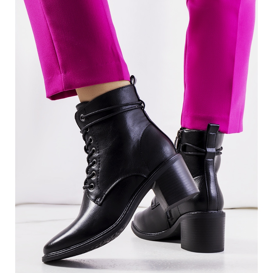 Cizme elegante, negre, Sanlow, din piele ecologică. Modelează cu o întindere superioară înaltă pentru gleznă, un fermoar pe lateral și o legătură decorativă în față. Un nas pătrat și un călcâi stabil de 6,5 cm înălțime. Ușor izolat cu o pătură de încălțăminte - Perfect pentru sezonul de toamnă/iarnă.