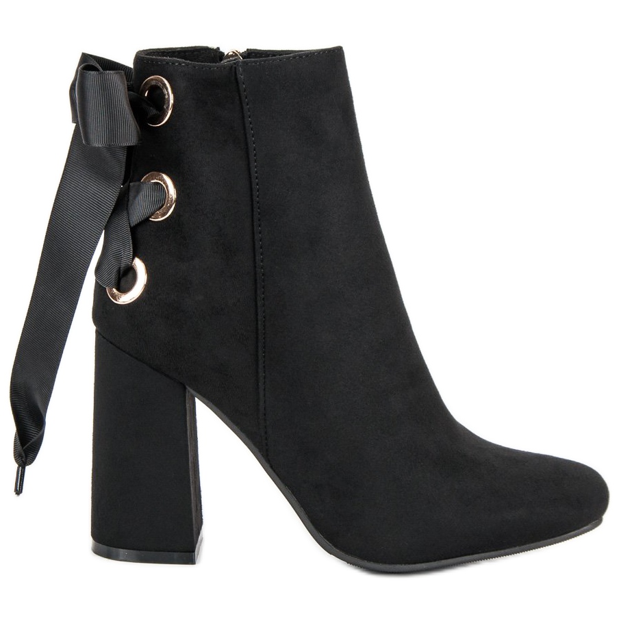 Botinele negre se caracterizeaza printr-o croiala senzuala care evidentiaza avantajele siluetei. Acestea alungesc și subțiază optic picioarele datorită stâlpului înalt de 10 cm, care face ca orice stil să arate elegant. Un accent suplimentar care atrage ochiul este fundita decorativă de pe spatele pantofului, adăugând subtilitate și farmec.