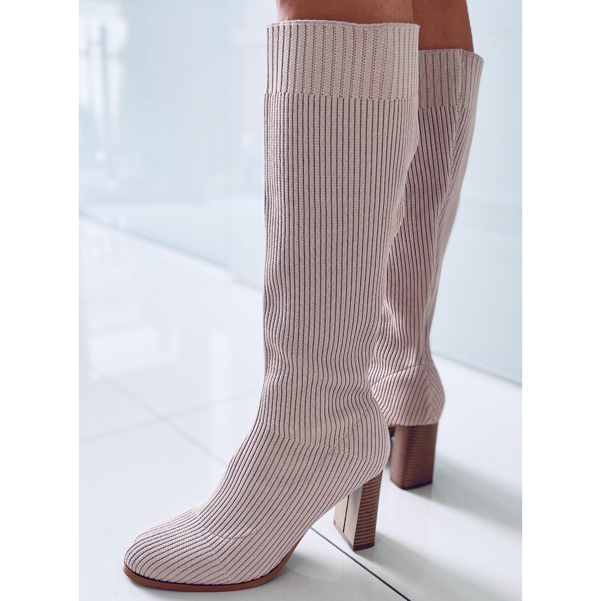 Detalii: Cizme șosete cu toc înalt de la Claudia Taupe bej