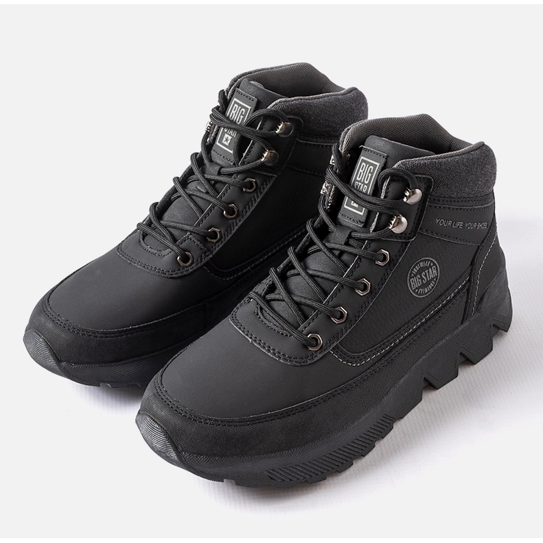Cizmele sport negre Big Star MM174016 sunt o propunere ideală pentru bărbații care apreciază funcționalitatea și stilul. Acești pantofi înalți într-o culoare clasică neagră vor fi o alegere perfectă pentru zilele mai reci, mai ales în sezonul Toamnă-Iarnă.