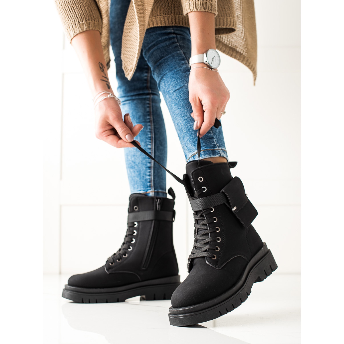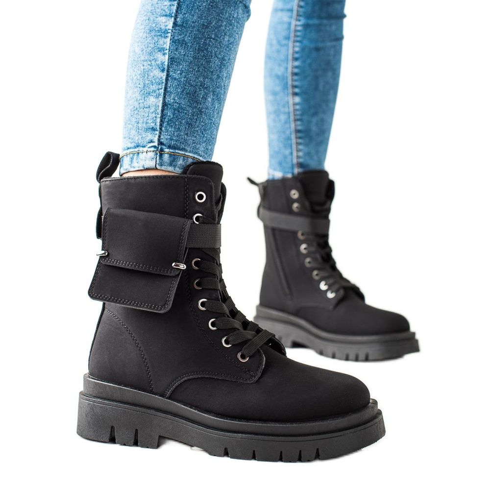 TRENDI TRENDI Cizme trappet cu șireturi și buzunar negru