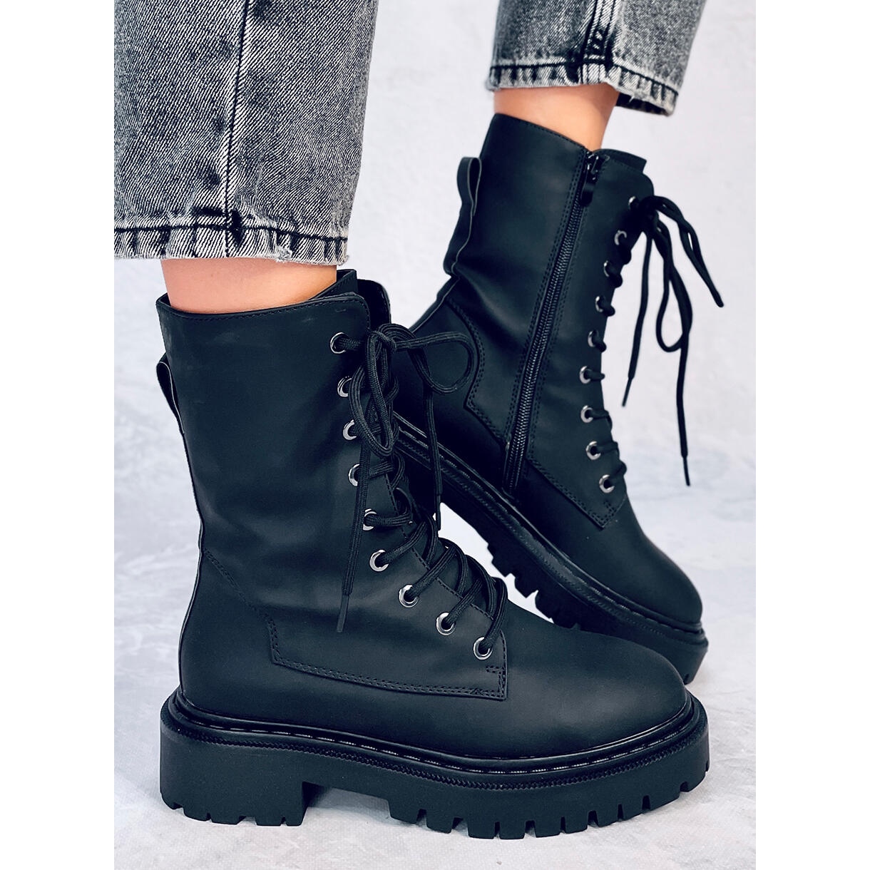 Șiretul clasic permite ajustarea individuală la lățimea piciorului, în timp ce fermoarul de pe partea superioară îl face ușor de pus și scos. Aceste cizme negre cu toc plat înalt de 3,5 cm sunt perfecte pentru stilul de zi cu zi, adăugându-le o notă militară. Datorită izolației sub formă de blană delicată, vor fi o alegere perfectă pentru zilele mai reci.