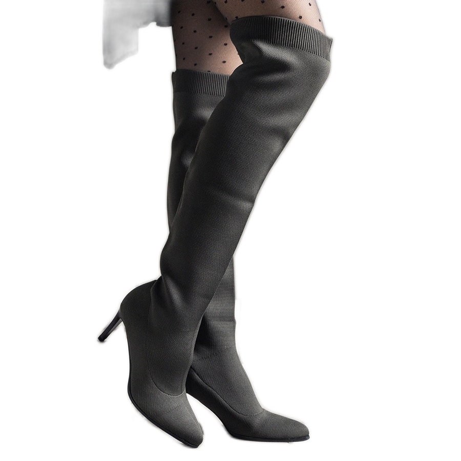 Cizmele glisante verzi pe un călcâi înalt cu un Atari Elastic Up este un hit absolut al acestui sezon, care ar trebui găsit în garderoba fiecărui feminin. Nasul lor elegant, ascuțit și o formă la modă, de mosclet, îi fac să se încadreze perfect în ultimele tendințe. Înălțimea de pe genunchi (59 cm) și călcâiul înalt de 8,5 cm subliniază figura, adăugând zveltul ei.