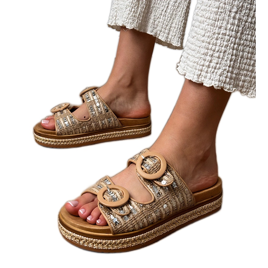 Bej universal, combinat cu o talpă maro, le face să se îmbine perfect cu diverse stilizări - de la rochii ușoare până la pantaloni scurți la modă. Un deget rotund și o platformă înaltă de 4,5 cm garantează confortul de a purta toată ziua, iar dungi împletite decorate cu paiete le oferă un personaj unic și o strălucire.