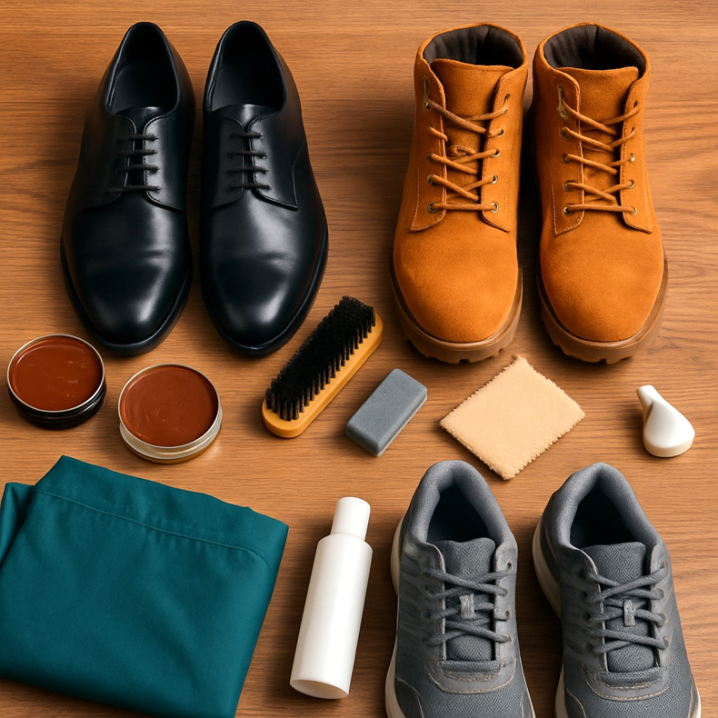 Cumpara: crema de pantofi, agent de impregnare, perii (pentru piele neteda si piele intoarsa), pantofi din lemn, deodorant pentru pantofi, ziar pentru uscare.