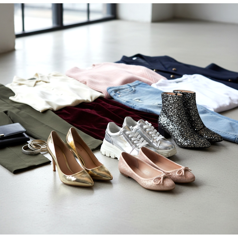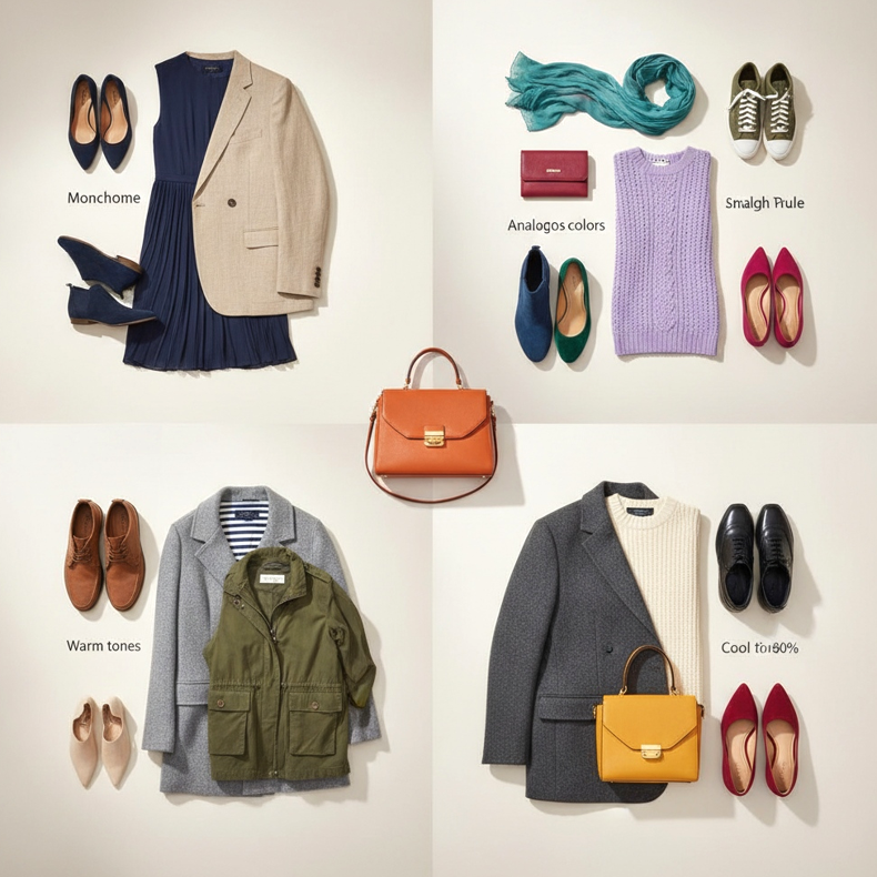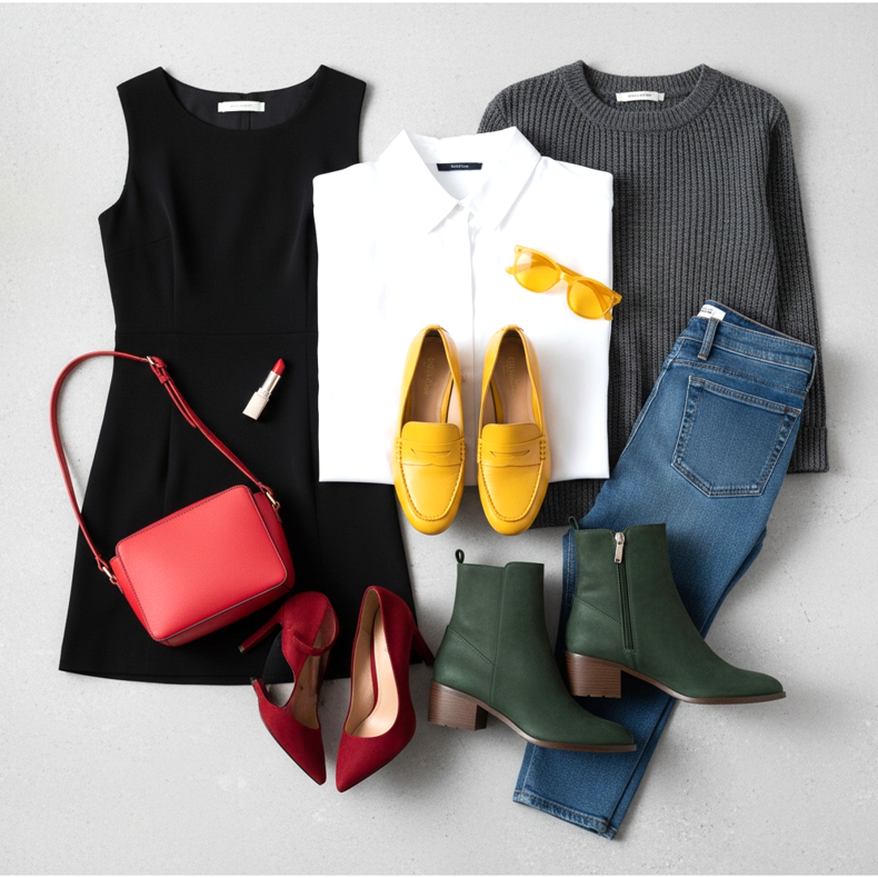 Regula 60-30-10 te va ajuta să echilibrezi culorile în stilul tău. 60% din ținută ar trebui să fie culoarea dominantă (de exemplu, rochie), 30% culoarea secundară (de exemplu, geantă, haină) și 10% culoarea de accent (de exemplu, pantofi, bijuterii). Pantofii ca accent pot fi expresivi fără a copleși întregul.