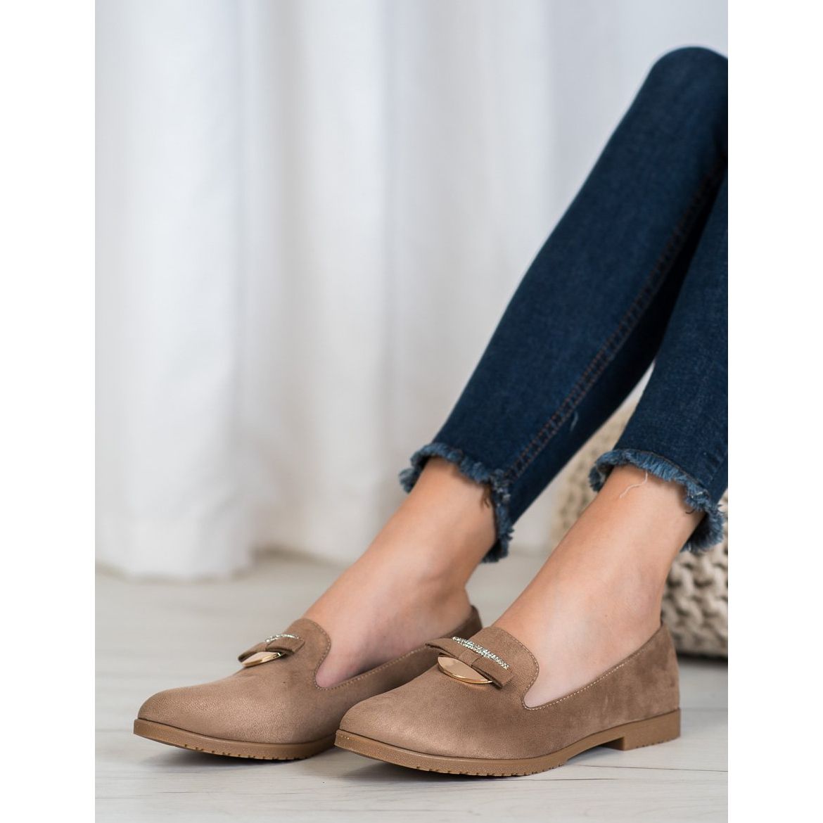 Partea exterioară a căptușei este confecționată din piele de căprioară ecologică de înaltă calitate, într-o culoare subtilă maro deschis, care conferă pantofilor un caracter unic. Degetele rotunde, în formă de migdale, le subliniază eleganța, iar un pandantiv bej decorat cu zirconii cubici și o fundă adaugă șic și originalitate. Un top bine modelat și un toc încorporat fac ca purtarea acestor pantofi să fie o plăcere pură - sunt ușor de îmbrăcat și confortabil de purtat.