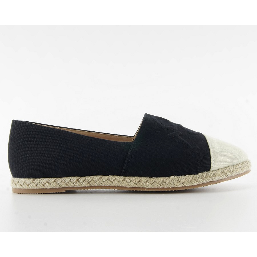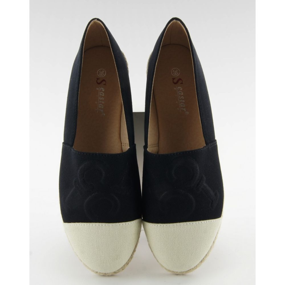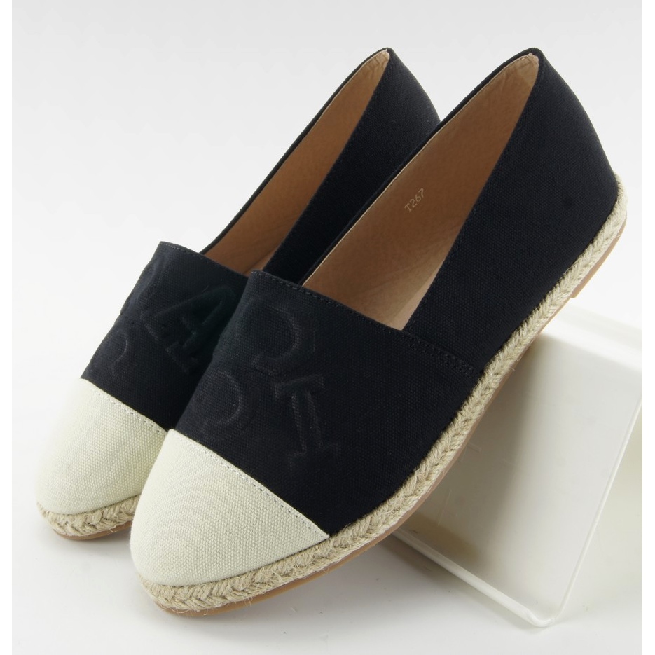 T267 Espadrile negre - încălțăminte de zi cu zi elegantă, ușoară și confortabilă. Croiala clasică de in este îmbogățită cu un vârf tăiat contrastant și un șnur de in pe talpă, care conferă pantofilor un caracter natural, de vară. Pe față există un relief sub formă de litere convexe, care adaugă originalitate și un efect premium subtil modelului.