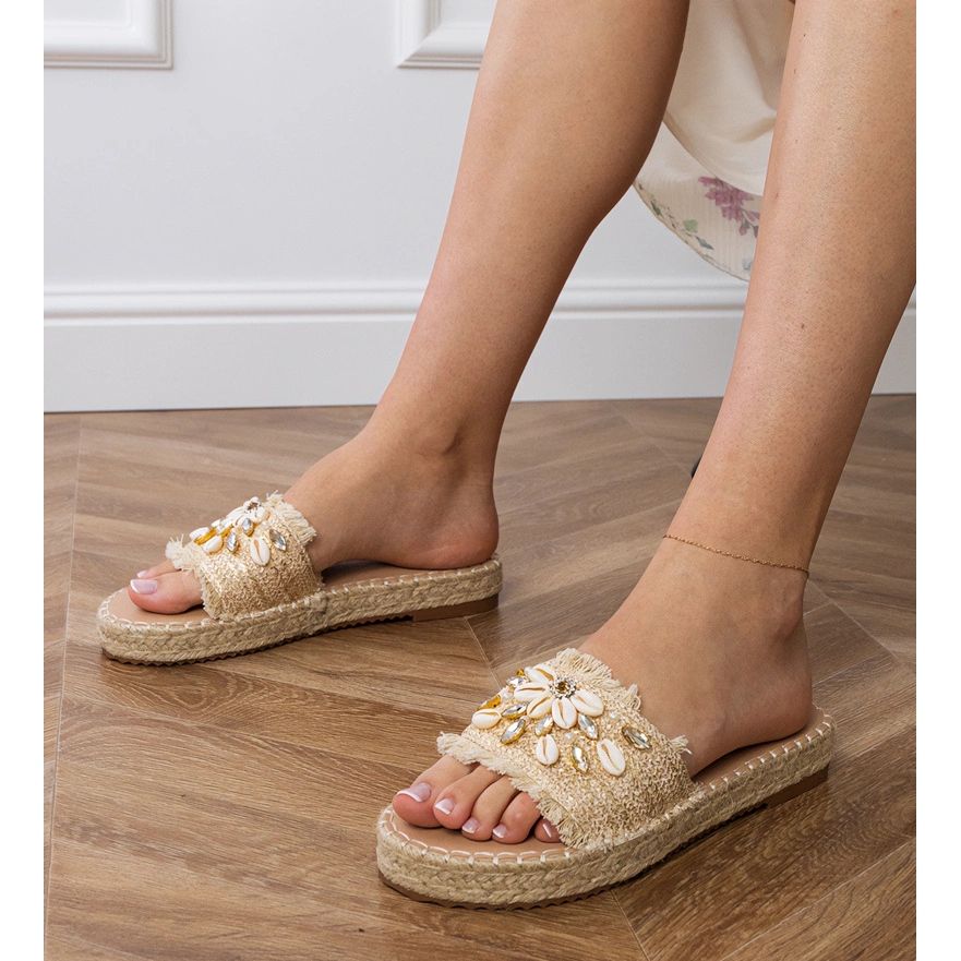 Espadrilles Flip Flip Flip cu scoici sunt un must-have în garderoba fiecărei femei la modă, combinând stilul și confortul. Culoarea lor elegantă, aurii atrage atenția și se încadrează perfect în tendințele de vară, ceea ce face ca fiecare stilizare să obțină un personaj unic.