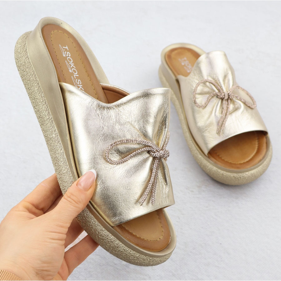 Descoperiți eleganța și confortul datorită clapetelor femeilor din piele de pe pană de aur T.Sokolski L25-154. Acești pantofi unici, confecționați din piele naturală de cea mai înaltă calitate, sunt o alegere ideală pentru femeile care apreciază atât stilul, cât și confortul. Papucii sunt caracterizați printr -o tăietură feminină și o culoare aurie la modă, care se încadrează perfect în tendințele de vară.