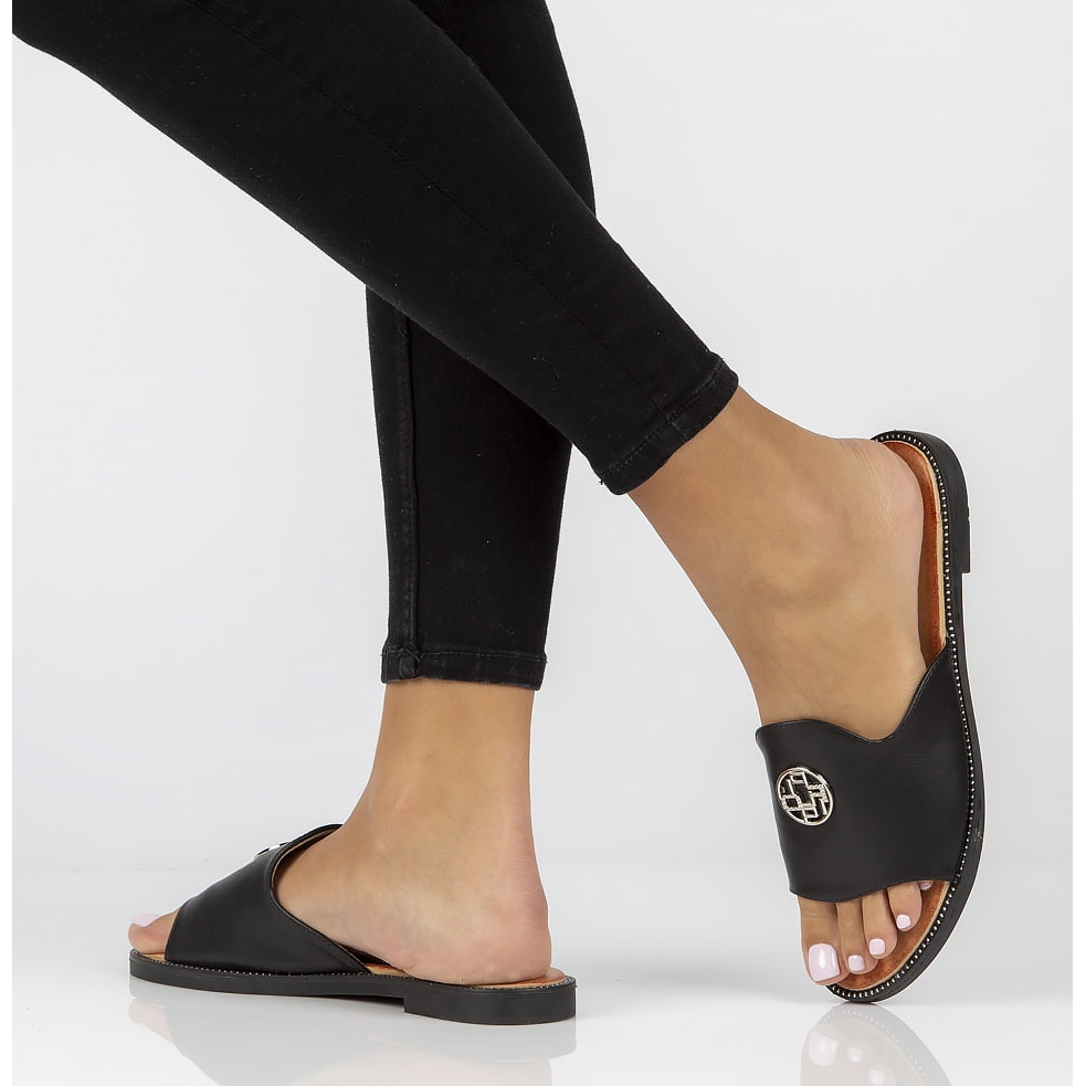 Confectionati din piele ecologica de inalta calitate, acesti slapi se caracterizeaza prin strasuri care le confera o stralucire subtila si un caracter unic. Căptușeala din piele naturală și branțul garantează confort maxim la purtare, făcându-vă picioarele confortabile în timpul utilizării pe tot parcursul zilei.