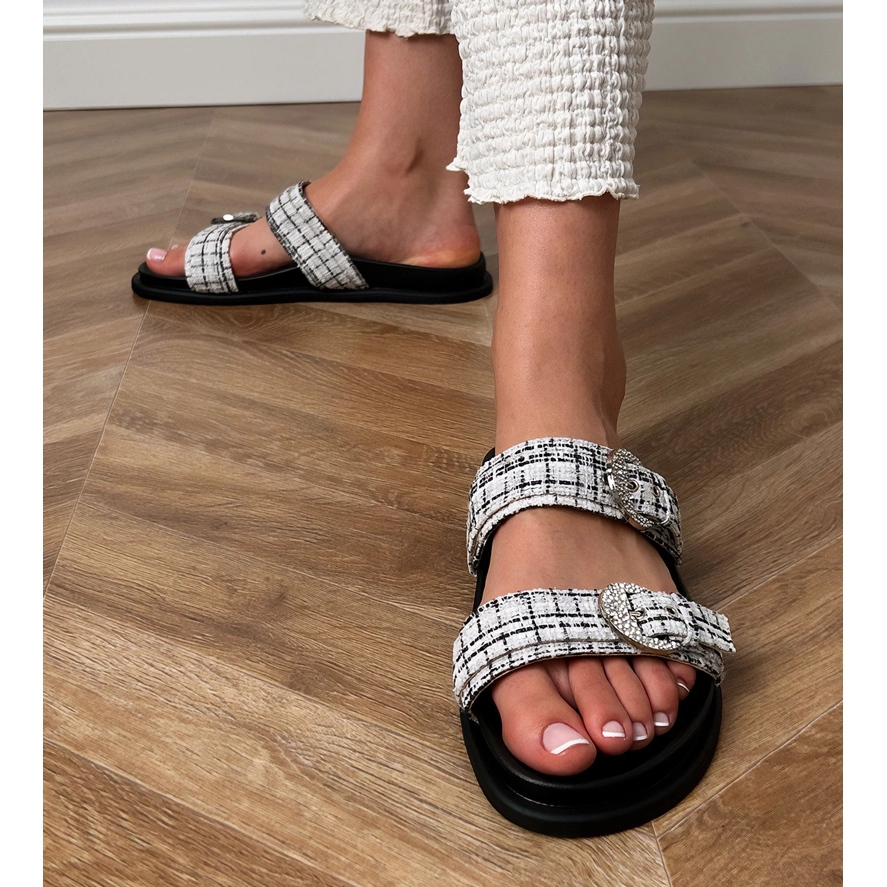 Fabricat din materiale de înaltă calitate, flip -flop -urile au un material extern din țesătură și o talpă de plastic durabilă. Un avantaj suplimentar este rinentele elegante de pe catarame, care le oferă un personaj unic și le fac un complement excelent pentru fiecare stilizare de vară. Designul lor minimalist înseamnă că se potrivesc atât cu haine casual, cât și mai elegante.