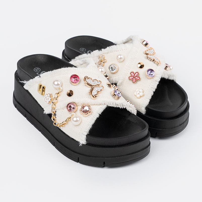 Platforma înaltă de 4,5 cm adaugă ușurință și, în același timp, oferă o amortizare adecvată la mers. În plus, flip -flops -urile sunt decorate cu zirconi, strasuri și un lanț, ceea ce le oferă un personaj la modă și îi face să devină un element preferat al garderobei pentru fiecare fashionistă.