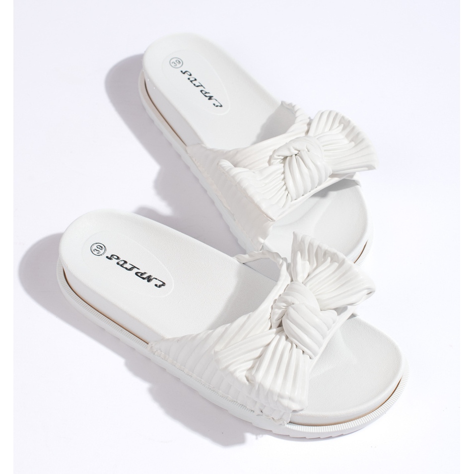 Talpa din plastic cu o înălțime de 3 cm asigură stabilitate și amortizare, datorită căreia fiecare pas devine o plăcere. Flip -flops -urile au un fermoar inserat, ceea ce face mai ușor să se pună și să decoleze, iar culoarea albă subliniază eleganța lor.