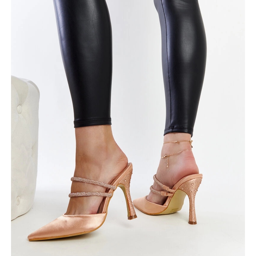 Șlapii bej cu toc înalt sunt chintesența unei combinații de design clasic și modern. Realizate din tesatura extrem de delicata, bej, atrag atentia prin aspectul lor unic. Forma inovatoare cu nasul ascuțit depășește ideile tradiționale despre șlapi, introducându-vă în sfera experimentelor de modă.