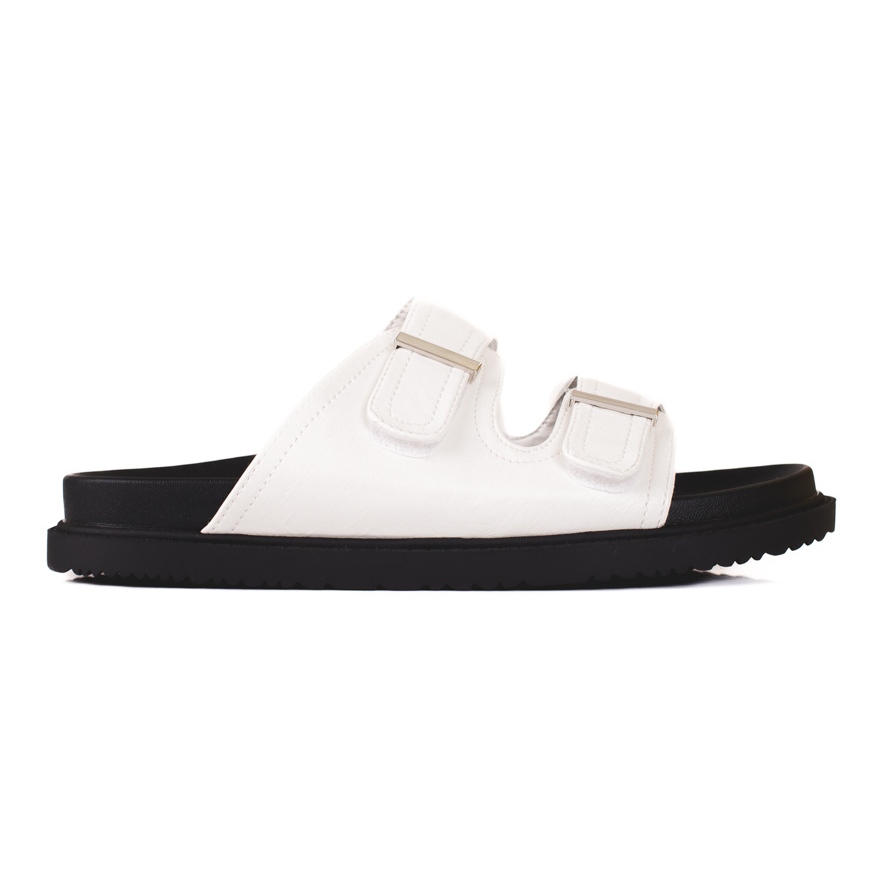 Talpa cu benzi de rulare, realizată din plastic, garantează aderență și durabilitate adecvate, ceea ce le face o alegere de încredere pentru utilizarea de zi cu zi. Un avantaj suplimentar este talpa neagră, care contrastează perfect cu culoarea albă a șlapilor, adăugându-le o notă de modă.