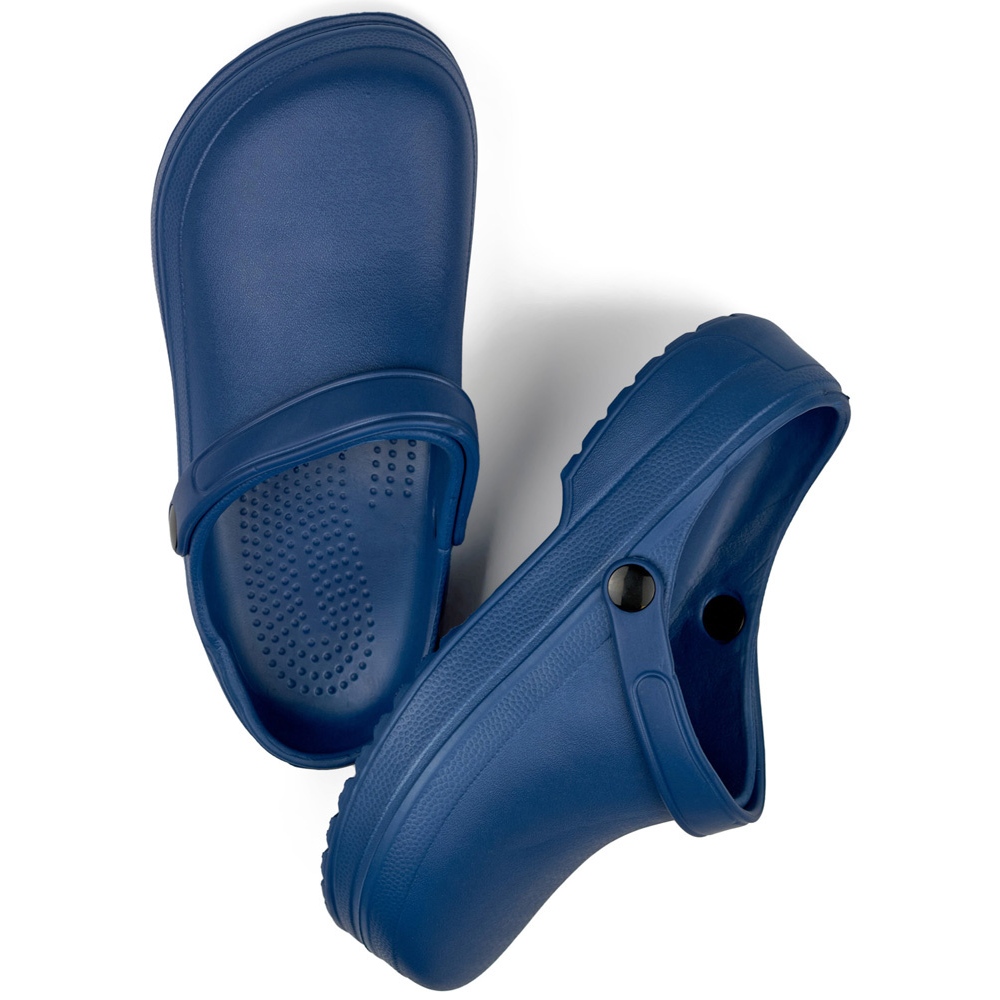 Papucii sunt confecționați din plastic de înaltă calitate, ceea ce le face extrem de ușoare și ușor de întreținut. Blue -ul lor la modă, cu un accent suplimentar sub forma unei talpe albastre, îi face să se îmbine perfect cu diverse stilizări, de la cele casual la cele mai elegante. Un nas rotund și un fermoar glisant sunt facilități care fac ca punerea și îndepărtarea clapetelor să fie o plăcere.
