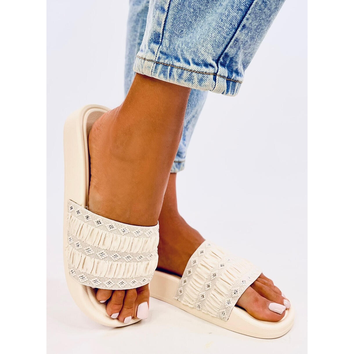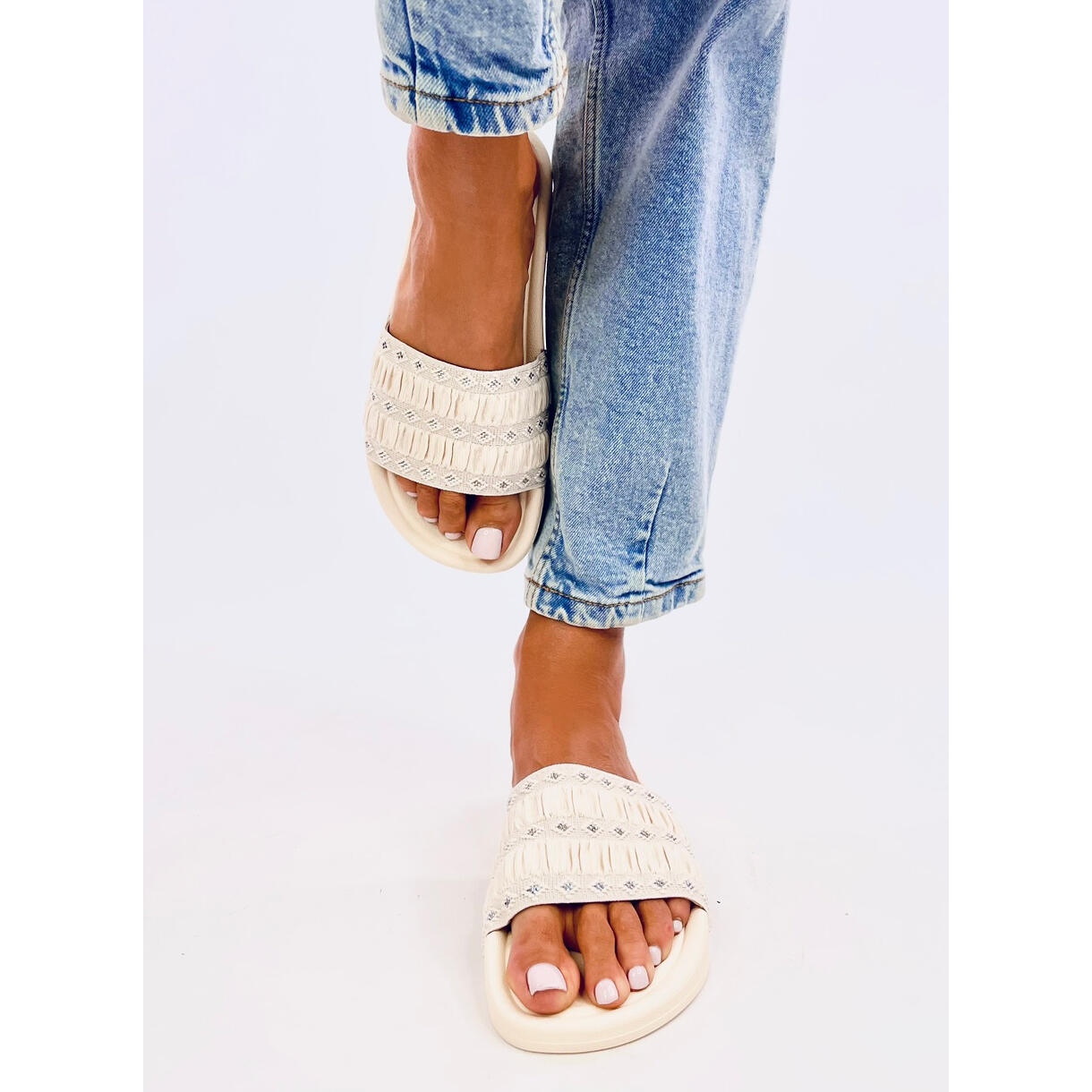 Un element caracteristic al acestor șlapi bej este o curea largă care nu numai că arată frumos pe picior, dar îi asigură și stabilitatea pe tot parcursul zilei. Decorațiuni subtile sub formă de zirconiu cubic adaugă un caracter unic pantofilor, făcând din fiecare pas o oportunitate de a vă prezenta stilul propriu, rafinat. Materialul exterior, adică o combinație de țesătură și cauciuc, garantează durabilitate și ușor de curățat.