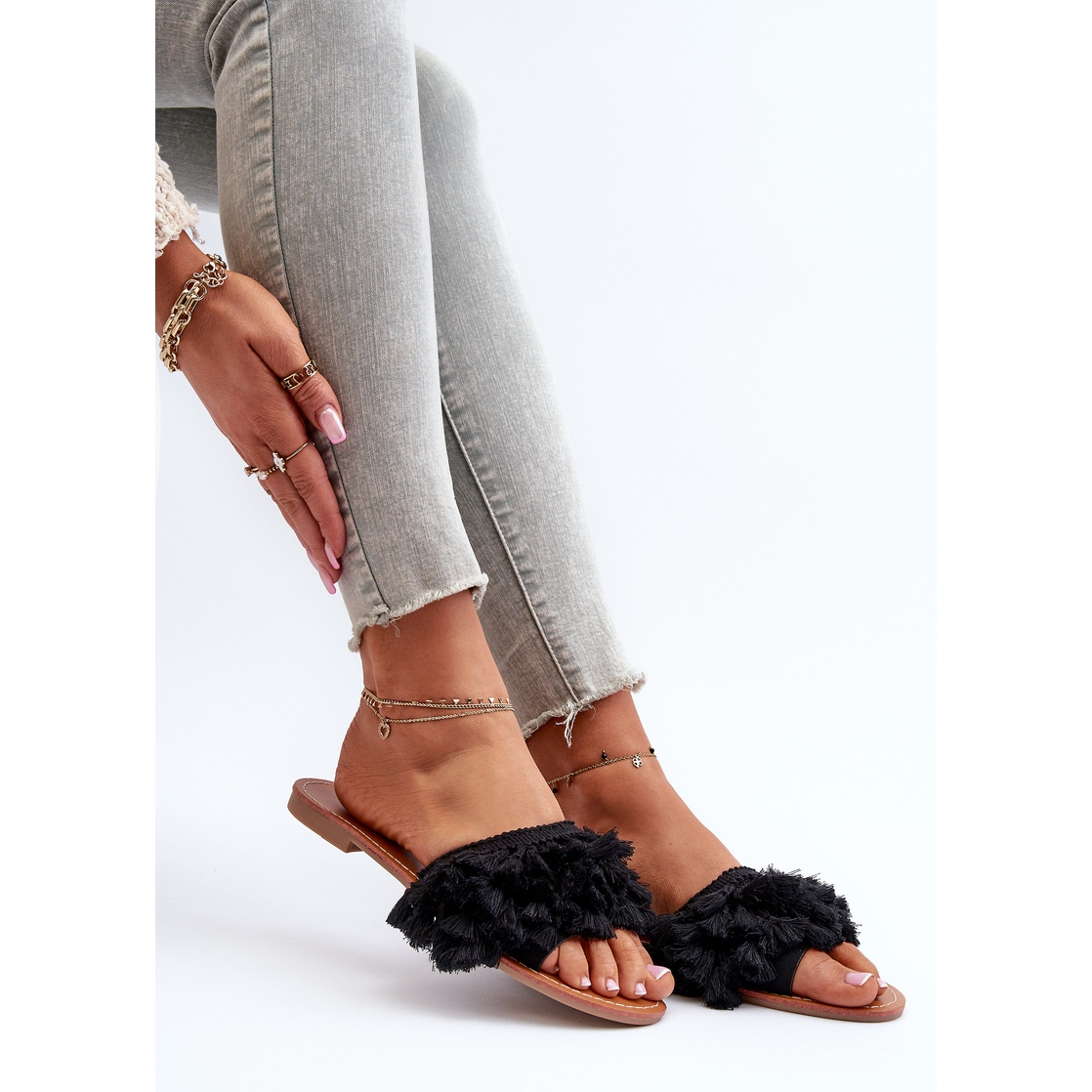 Clapele de femei plate cu franjuri Black Rialle sunt o alegere excelentă pentru fiecare femeie care dorește să combine confortul cu moda. Aceste tocuri plate elegante cu franjuri se disting prin designul său original, care se încadrează perfect în tendințele de vară. Culoarea lor minimalistă, neagră, îi face să se potrivească cu multe stiluri - atât casual, cât și mai elegante.