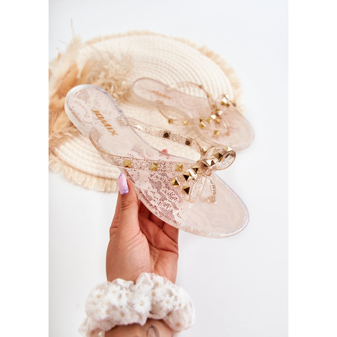 Elementele decorative elegante sub formă de strasuri și o fundă eficientă în față atrag atenția și adaugă farmec. Șlapii sunt așezați pe un toc plat înalt de 1 cm, care garantează confortul purtării pe tot parcursul zilei. Inserția din plastic asigură suportul adecvat al picioarelor, eliminând senzația de oboseală.