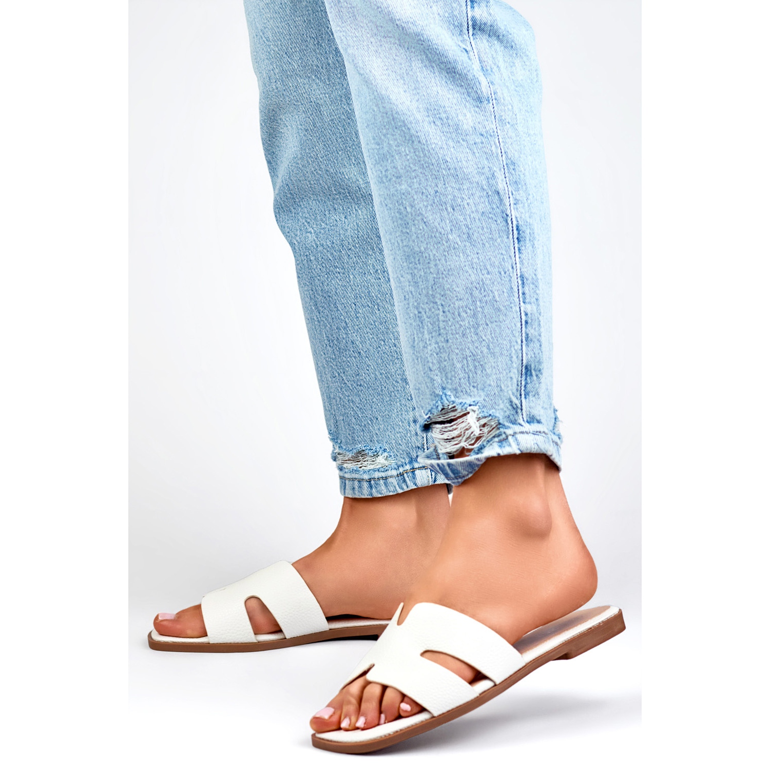 Insertul este, de asemenea, din piele ecologică, ceea ce face ca flip -flop -urile să fie plăcute pentru picior și chiar în timpul unei uzuri lungi oferă un confort adecvat. Talpa bej merge perfect cu culoarea albă a superiorului, creând un design elegant și minimalist.