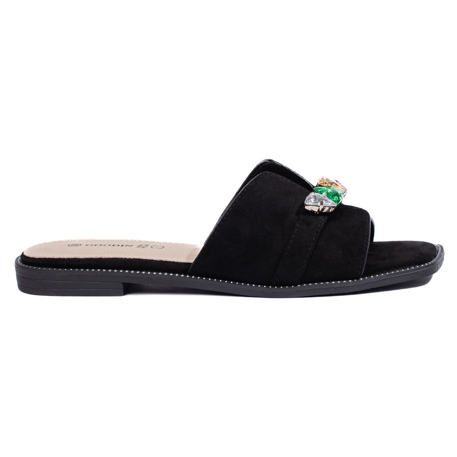 Papucii vin într -o culoare neagră elegantă, ceea ce le face un element universal al garderobei, care se potrivește cu diverse ținute - de la pantaloni liberi la rochii de vară. Înălțimea platformei de 2 cm face ca clapele să fie suficient de confortabile pentru a fi purtate pe parcursul zilei.