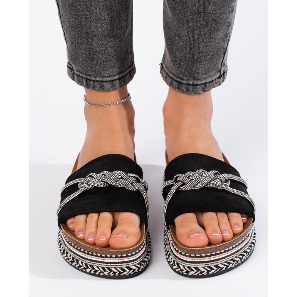 Culoarea neagră cu adaos de zirconi conferă șlapilor un finisaj elegant, făcându-le o completare perfectă atât pentru stilurile de zi cu zi, cât și pentru cele mai elegante. Interiorul șlapilor este finisat cu o inserție textilă, ceea ce mărește confortul purtării pentru o perioadă lungă de timp.