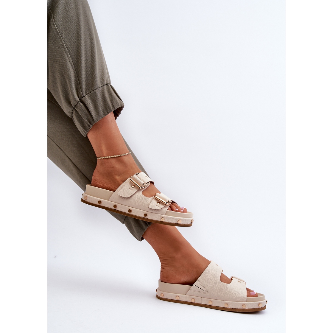 Există două curele în partea din față a șlapilor, care nu numai că arată frumos, dar asigură și un sprijin adecvat pentru picior. În plus, strasurile subtile și știfturile le conferă un caracter original și le deosebesc de alte modele. Datorită închiderii cu slip-on, punerea și scoaterea clapetelor este extrem de simplă și rapidă.
