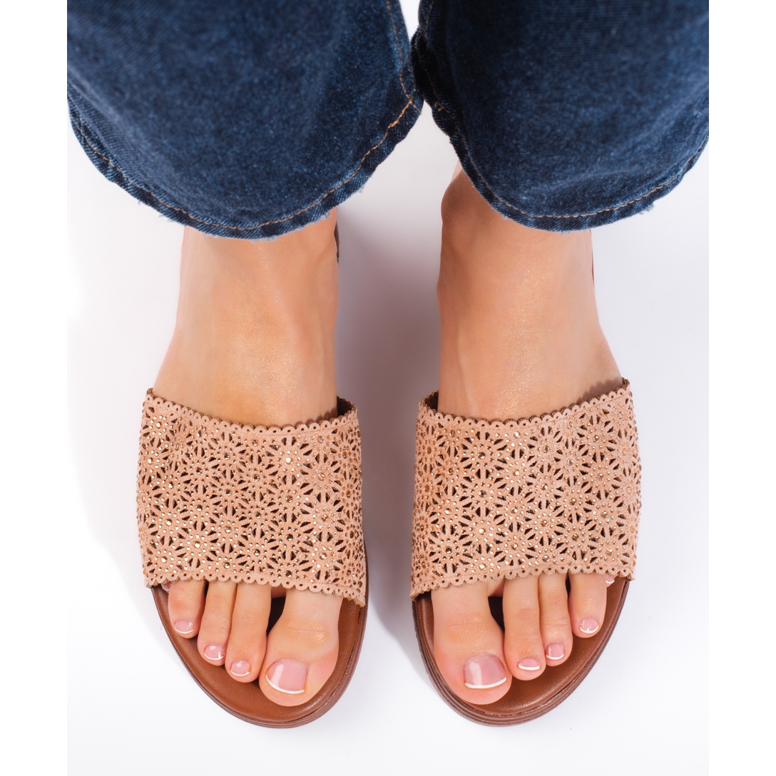 Flip-flops au un toc deschis și o închidere slip-on convenabilă, ceea ce face extrem de ușor să le îmbraci și să le scoți. Confectionate din piele intoarsa ecologica de inalta calitate, ofera nu doar un aspect elegant, ci si durabilitate si usurinta in intretinere. O parte din estetica lor fermecătoare sunt detaliile ajurate și strasurile subtile care adaugă strălucire și disting aceste șlapi de alte modele.