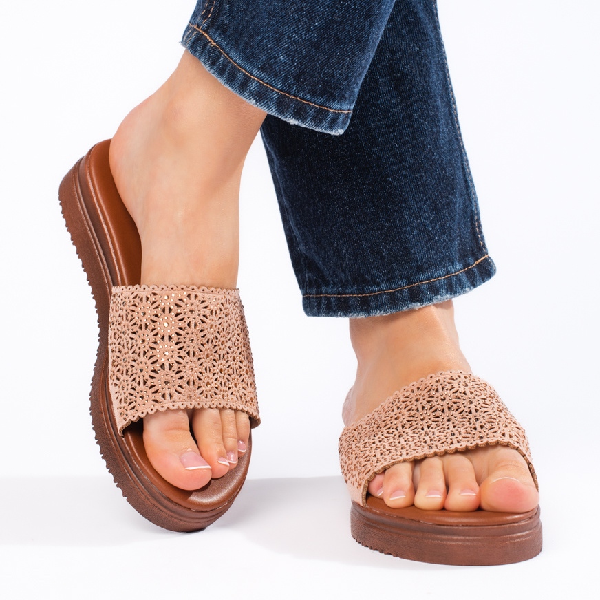 Cu o platformă de 4 cm înălțime, acești șlapi nu numai că arată elegant, dar oferă și aderență și confort adecvat. Talpa netedă de plastic maro contrastează cu rozul delicat al căptușei, creând un întreg armonios. In plus, brantul din piele ecologica garanteaza confort maxim in timpul utilizarii.