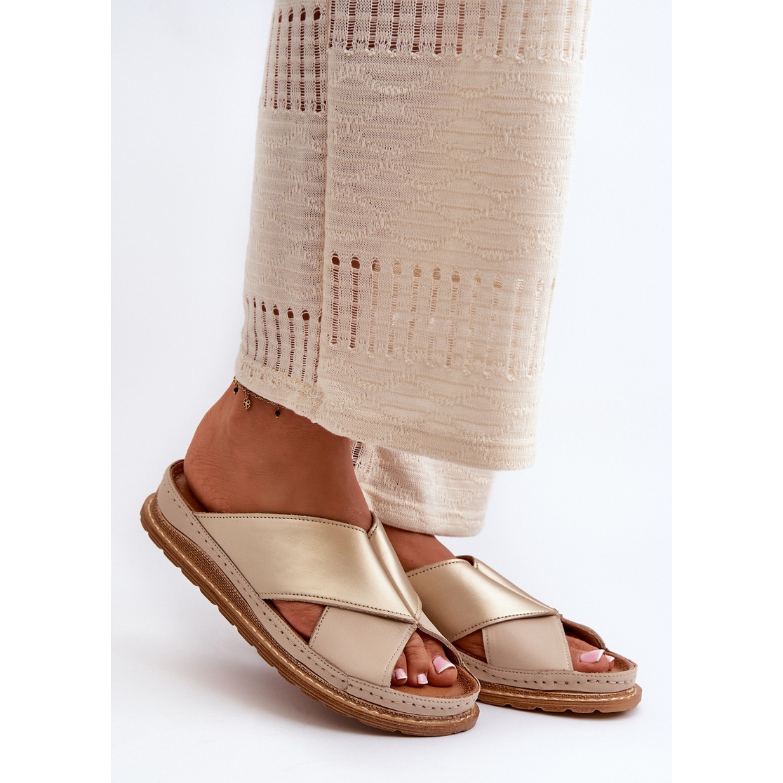 Acestea sunt șlapi Maciejka 04986-04 din piele, într-o nuanță unică de auriu și bej, care vor fi o completare perfectă pentru orice stil de vară. Acești șlapi confortabili, fabricați manual în Polonia, combină cea mai înaltă calitate și designul elegant, care este semnul distinctiv al mărcii Maciejka.