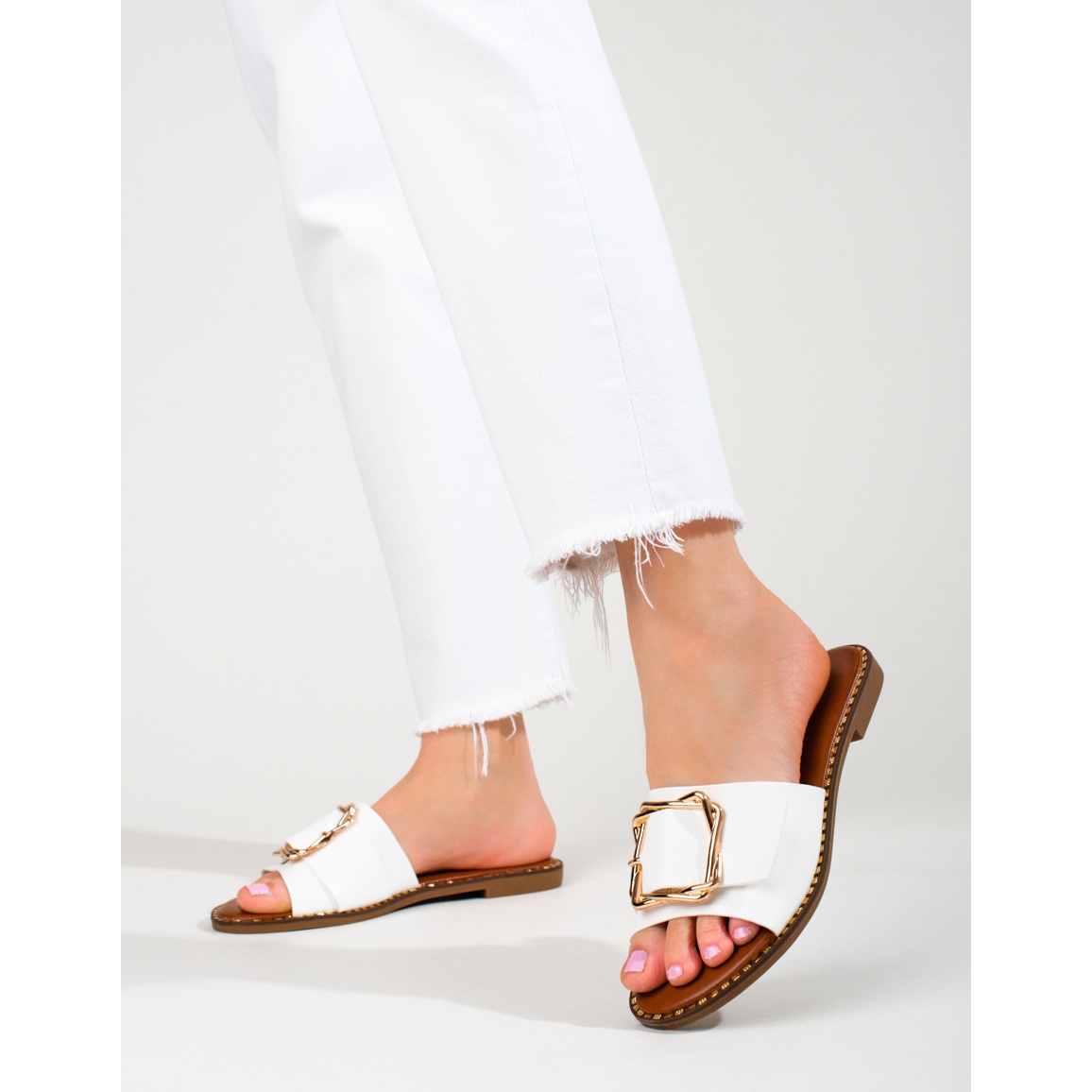 Alegeți eleganța pentru fiecare zi și bucurați-vă de confortul oferit de șlapii albi cu cataramă Shelovet!