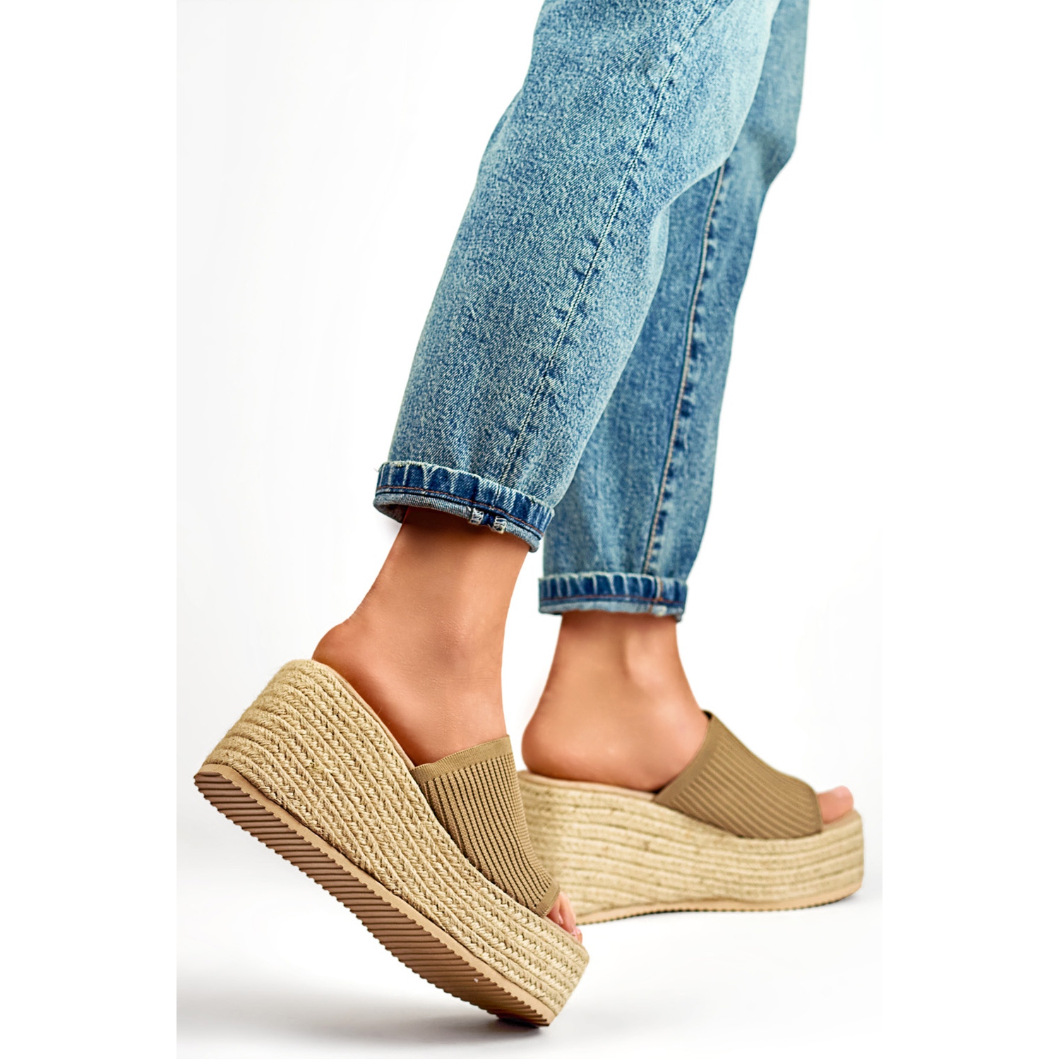 Clapele sunt caracterizate printr -o platformă înaltă de 9 cm, care nu numai că adaugă optic centimetri, dar face și mersul în ele mai plăcut și mai puțin obositor. Designul introdus face mai ușor să se pună și să decoleze, iar culoarea lor neutră bej le face să se potrivească cu multe stiluri - de la fiecare zi cu zi la cele mai elegante.