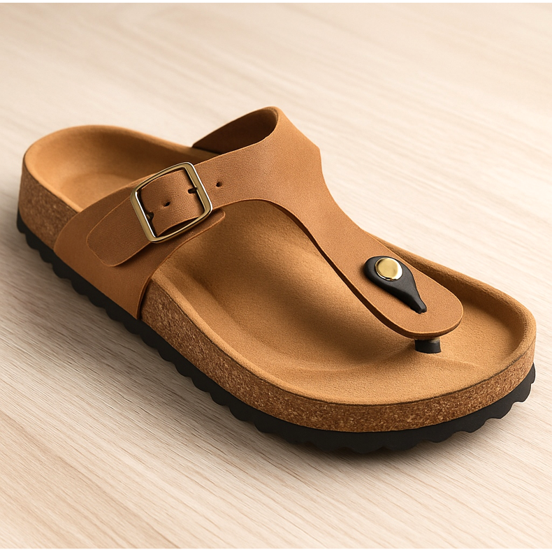 Căutați modele cu un profil anatomic clar definit, care susține arcul natural al piciorului. Cele emblematice funcționează excelent aici Șlapi Birkenstock cu branț din plută, conturată.