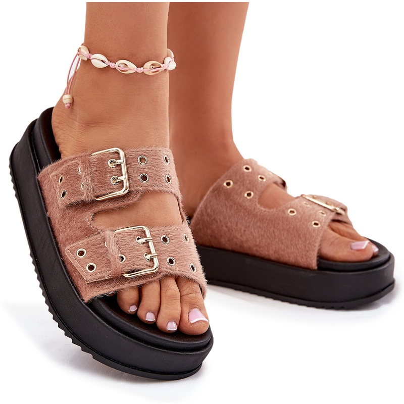 Detalii: Flip -flops pentru femei cu catarame de aur pe platformă bej roz