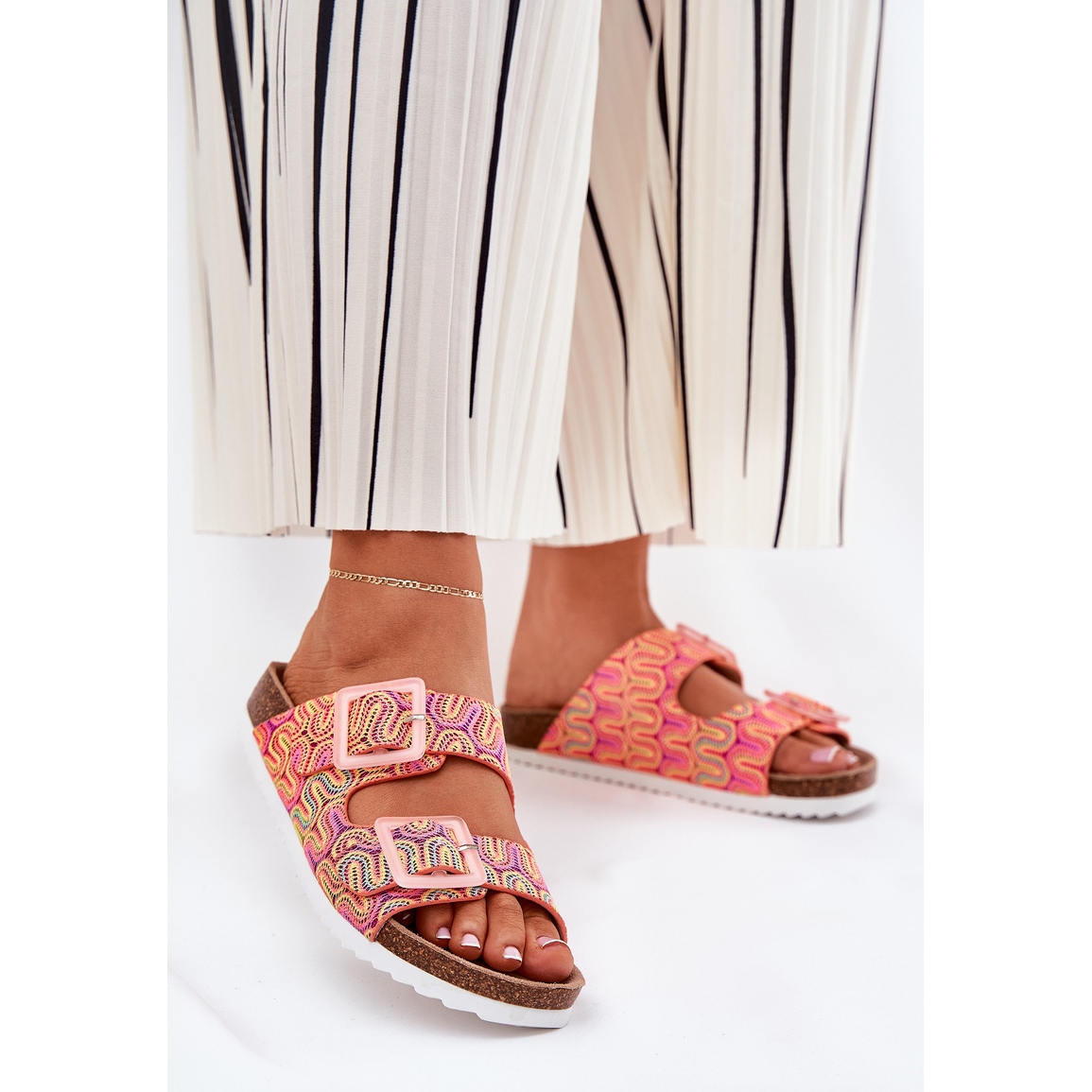 Două dungi cu catarame, decorate cu sclipici subtile, le oferă un personaj unic și le fac un plus ideal la stilizările de vară. Insularea din piele de căprioară profilată din piele ecologică are grijă de amortizarea piciorului drept, ceea ce le face alegerea perfectă pentru plimbări lungi sau întâlniri cu prietenii.