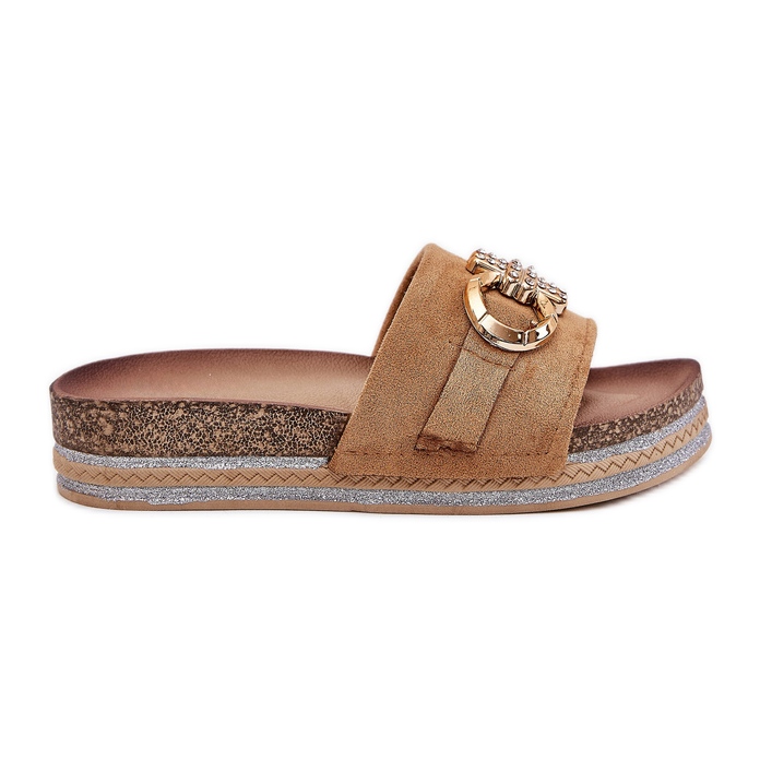 Detalii: Flip -flops pentru femei pe platformă cu cămilă cu sclipici și decor auriu maro