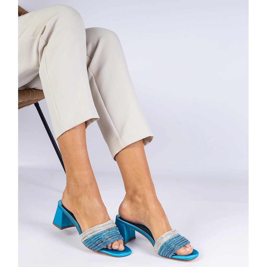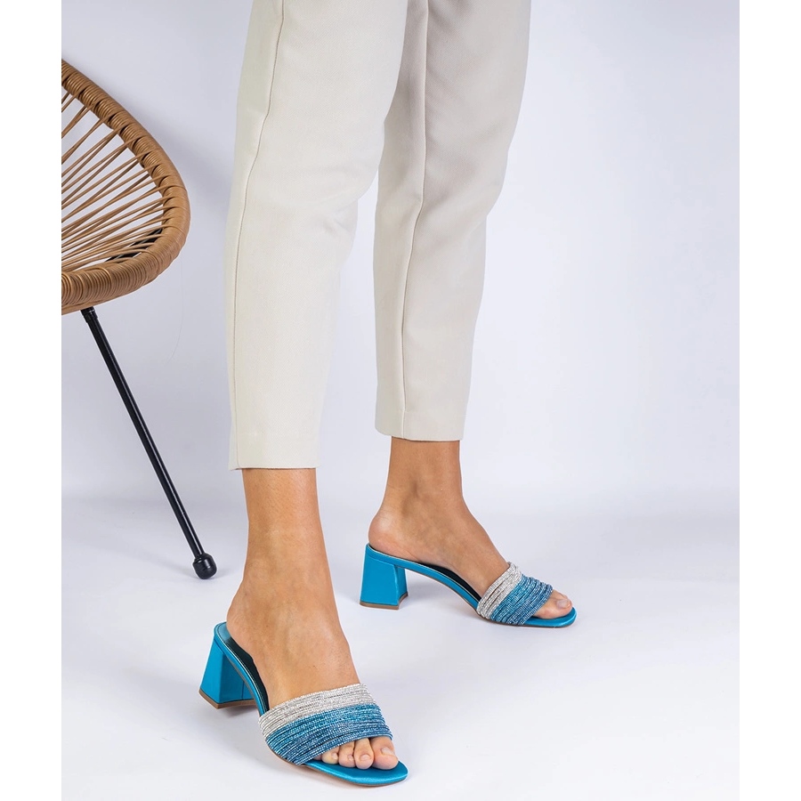 Fabricate din materiale de înaltă calitate, au o inserție de piele ecologică care oferă confort. Avantajul lor neobișnuit sunt strasurile, care adaugă strălucire, ceea ce face ca fiecare stilizare să obțină expresivitate. Clapele de albastru intensiv se îmbină perfect cu diverse ținute, de la rochii elegante la pantaloni casual.