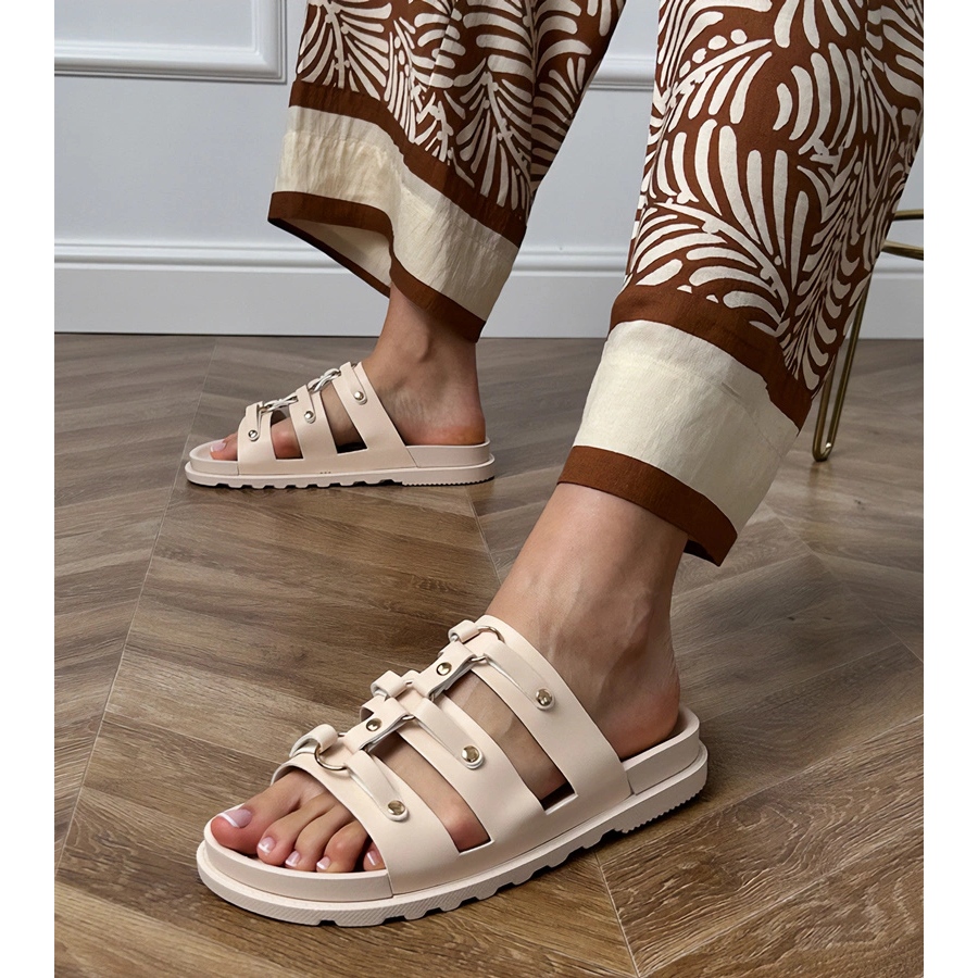 Flip -flops -urile au un călcâi plat cu o înălțime de 3 cm, ceea ce le face perfecte pentru mersul lung și ieșirile zilnice. Nuanța bej este extrem de versatilă, datorită căreia le puteți potrivi cu ușurință cu diverse stiluri - atât cu rochii aerisite, cât și cu pantaloni clasici. Rinonele care decorează partea superioară le oferă originalitatea și caracterul modern, atrăgându -și ochii și adăugând expresivitate ținutelor tale.