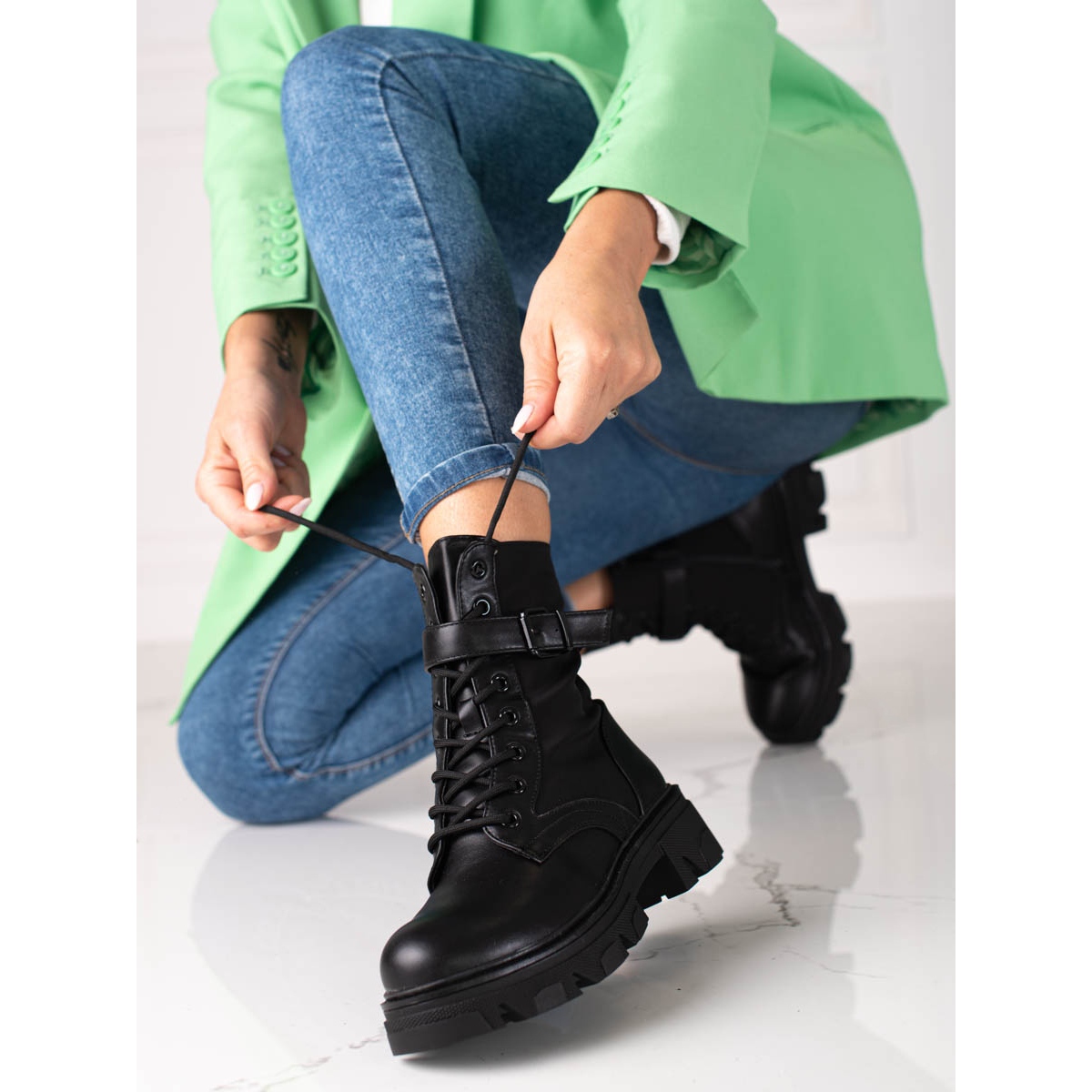 Vă prezentăm cizmele de muncitori Shelovet de damă negre, care sunt o combinație perfectă de stil și confort. Aceste cizme la modă cu o platformă groasă sunt alegerea perfectă pentru zilele de toamnă și iarnă, oferind atât căldură, cât și un aspect la modă.