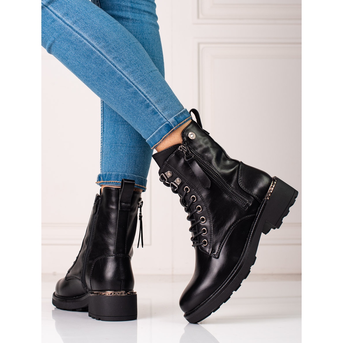 Descopera cea mai recenta tendinta in materie de incaltaminte pentru sezonul toamna/iarna cu cizmele de dama cu siret Shelovet intr-o culoare clasica neagra. Aceste botine stilate sunt confectionate din piele ecologica de inalta calitate, ceea ce le face nu doar un accent la moda, ci si o alegere prietenoasa cu mediul. Datorită călcâiului încorporat, rigidizat, picioarele tale se vor simți confortabil și stabile.